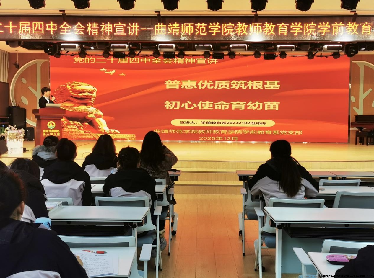 为深化“学习型”党支部建设,推动党的创新理论扎根基层,近日,曲靖师范学院教师教育学院学生第一党支部创新开展“青言青语话改革”主题党日活动。查兴杰、郑涛两名学生党员作为“新时代青年讲师团”成员,走进麒麟区第二幼儿园,开展党的二十届四中全会精神专题宣讲,探索出高校与基础教育单位党建共建新路径。