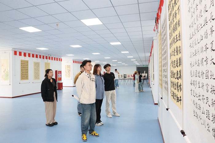展画卷 共绘祖国新貌。走进学校图书馆一楼党建主题展厅,映入眼帘的是正在举办的“辉煌成就,伟大复兴——庆祝中华人民共和国成立75周年主题展”,展览分为“屹立东方、改革开放、走向复兴”三大篇章,图文并茂地讲述了新中国成立以来波澜壮阔的发展历程和辉煌成就,来参观学习的学生络绎不绝。与此同时,曲阜校区也举办了一场别开生面的艺术作品展。师生们发挥专业优势和自身特长,以笔为媒,以心传情,创作出一系列书法、绘画、摄影作品。一幅幅精美的作品,或气势磅礴,或细腻温婉,无不透露出创作者对祖国的深情和对美好生活的憧憬。这些作品不仅展示了师生的艺术才华,更成为连接过去与未来、传统与现代的桥梁,让大家在欣赏的同时,感受到祖国的伟大和美好。