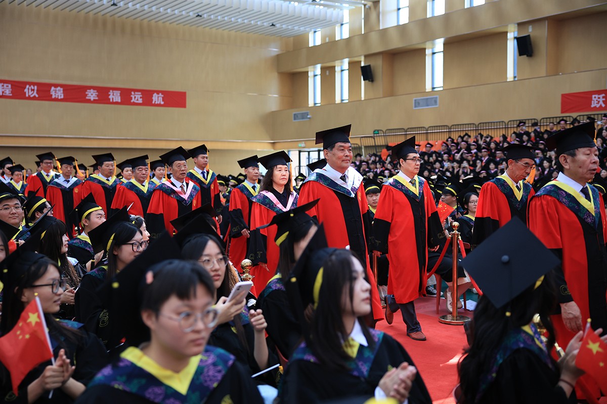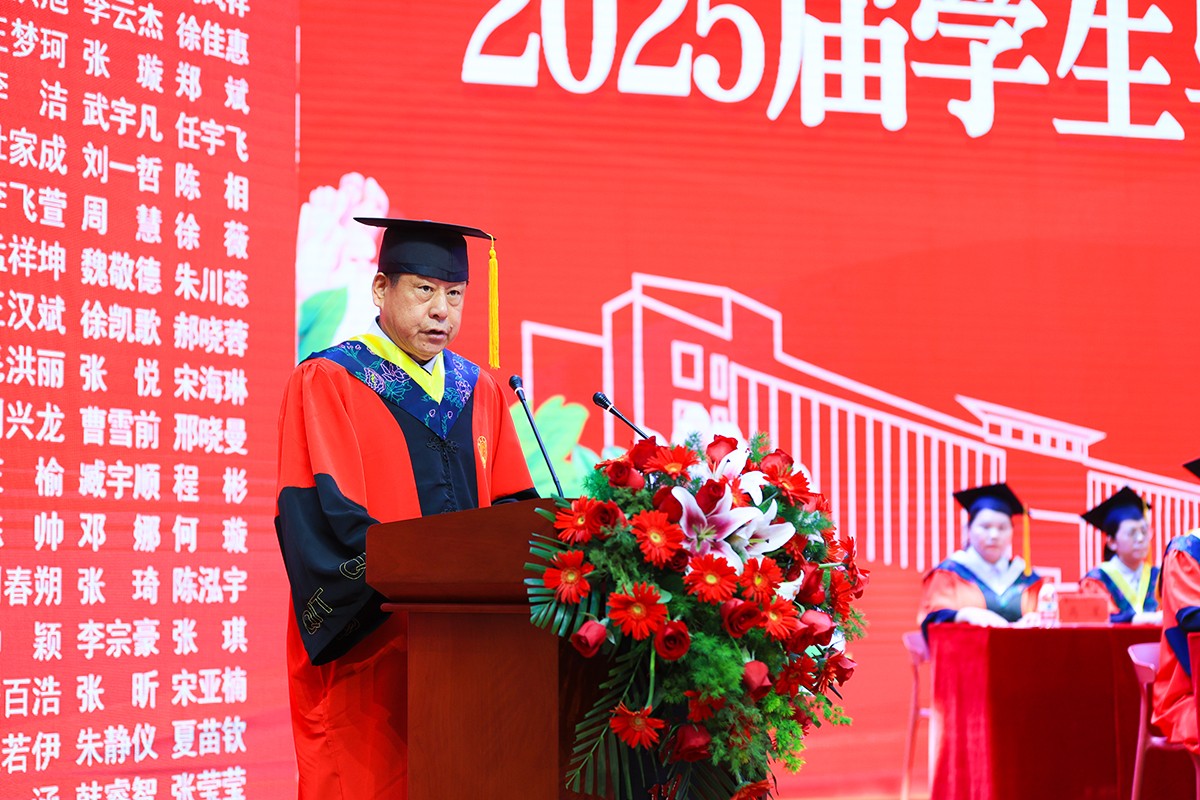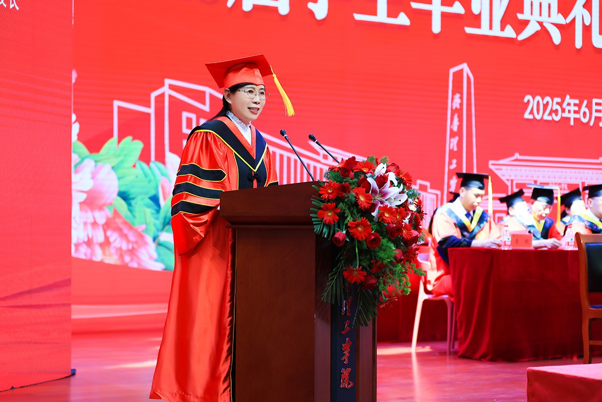 在雄壮的国歌声中,毕业典礼正式启幕。校长、学位委员会主任常翠鸣教授致辞,深情回顾了2025届毕业生所走过的大学时光、取得的丰硕成果。向圆满完成学业的全体毕业生表示祝贺,向一路陪伴、支持学子成长成才的老师们表示感谢。为即将起航未来的2025届毕业生们,送上最美好的希望和祝福!她深情寄语全体毕业生,把“家国”装进心里,用“实干”走向远方,让“文脉”滋养人生,在推进强国建设、民族复兴伟业中展现青春作为、彰显青春风采、贡献青春力量,奋力书写为中国式现代化挺膺担当的青春篇章!
