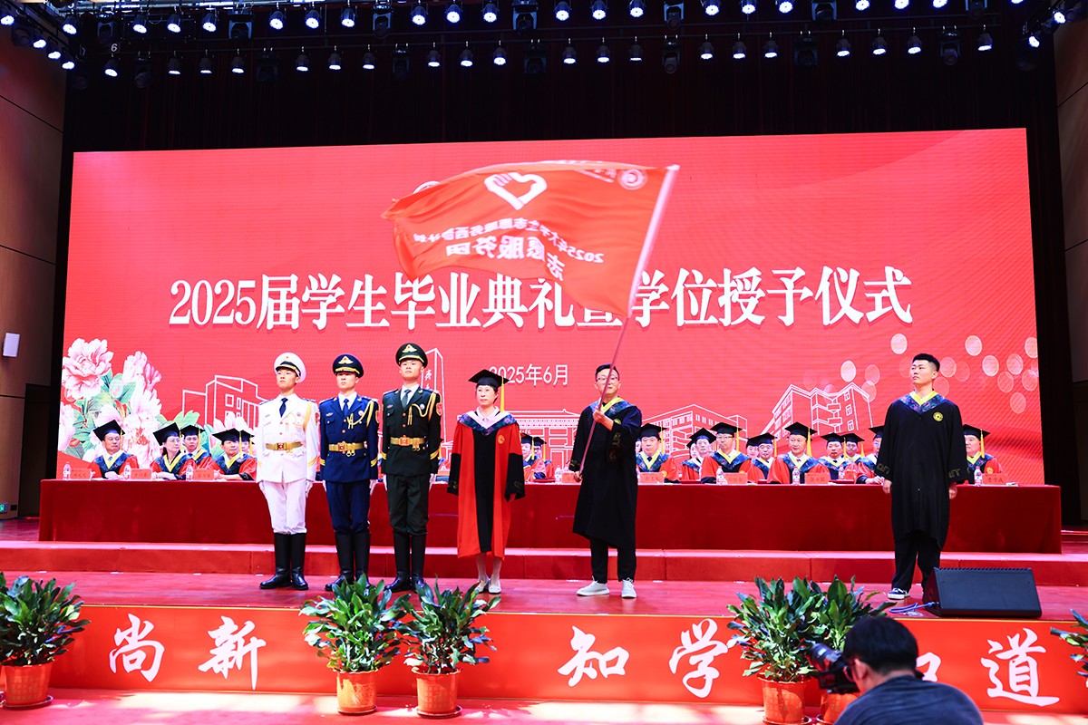 典礼上,学校表彰了2025年大学生志愿服务西部计划优秀组织单位和先进个人,为2025年大学生志愿服务西部计划志愿服务队授旗;学团工作处向学校校友工作委员会移交2025届毕业生名单。