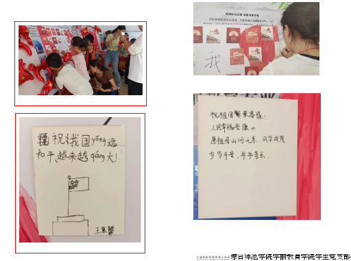 活动一开始,参与活动的同学纷纷进入现场。在“我为祖国献祝福”活动中,我们拿起笔,将心中对祖国的热爱与感激之情化为一行行真挚的文字。“祝祖国繁荣昌盛,人民幸福安康!”此外,小朋友特别的祝福作品也充满了对祖国的热爱。这些话语和作品里充满了力量,表达了我们对祖国的深深眷恋和美好祝愿。