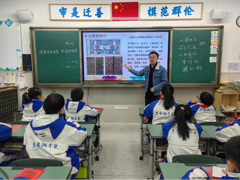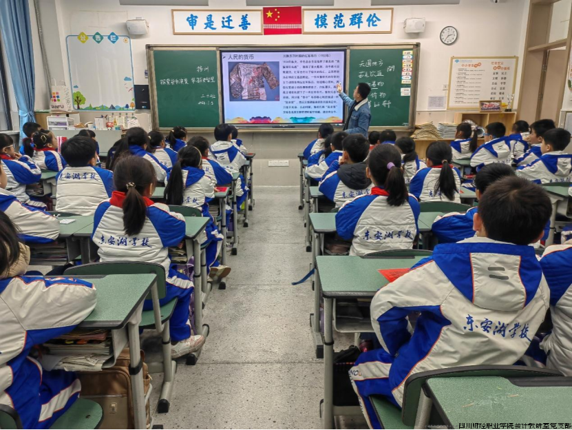 作为主讲人,唐进为2023级6班全体同学带来了一堂别开生面的“货币发展史”主题课。通过实物展示、故事讲述与问答互动相结合的形式,串联货币变迁历程,生动展现了从古代货币形态到现代信用体系的发展脉络。同时,有机嵌入川陕苏区红色货币、“钱衣裳”相关内容,在开拓学生眼界的同时,创新叙事方式与互动形式融入红色财经文化,让财经素养教育更加鲜活而深刻。