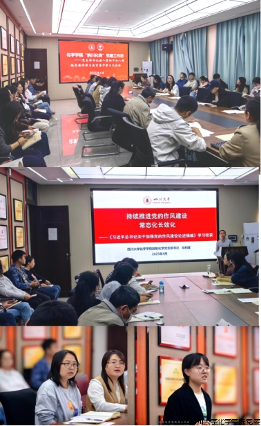 四川大学化学学院党委书记谢均以《作风建设常抓不懈再出发——深入贯彻中央八项规定精神学习教育》为题讲授了党课。她结合工作实际和案例分析,深入浅出地讲解了中央八项规定精神的背景与意义、中央八项规定精神的内容与成效、党的十八大以来作风建设的生动实践和宝贵经验、当前作风建设的挑战与举措、加强党的作风建设的任务要求等,使大家对中央八项规定精神有了更加深刻全面的认识。她希望各支部书记、支委不断提升理论水平、强化党性修养、筑牢思想根本,确保学习教育走深走实,切实将学习成果转化为改进作风的具体行动。