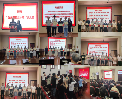 学院党委副书记肖波宣读表彰决定。党委书记谢均为谢明贵同志颁发“光荣在党50年”纪念章。院领导为先进党支部、优秀共产党员、优秀党务工作者代表颁奖。