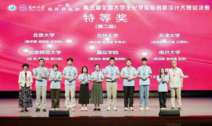2025年8月21日-24日,“小聪-德祥科技杯”第五届全国大学生化学实验创新设计大赛总决赛在兰州大学城关校区成功举办。化学学院2022级本科生孙弈文、李佳佳、蒋涵宇三位同学的改进实验作品“苯甲醇的绿色选择性氧化”以西南赛区一等奖的优秀成绩冲入总决赛,经过激烈的角逐,从1000余支参赛队伍中脱颖而出,斩获全国总决赛特等奖。本次参赛作品的指导教师为化学实验中心任小雨博士、化学学院王天利教授。
