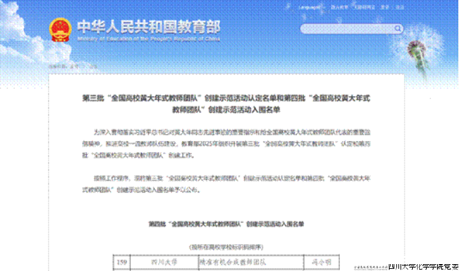 日前,教育部公布了第四批“全国高院黄大年式教师团队”名单,化学学院冯小明院士担任负责人的“精准有机合成教师团队”入选。这一荣誉不仅是对团队多年来坚守教育初心、勇攀科研高峰的高度认可,更为学院学科建设、人才培养与科研创新工作注入新动能,标志着学院在高水平教师队伍建设领域再迈新台阶。