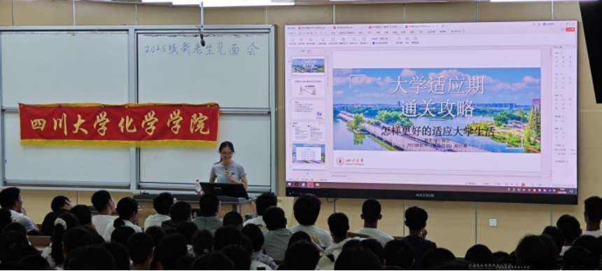 9月9日下午,四川大学化学学院2025级新老生见面会在江安校区综合楼C307顺利举行。此次见面会由四川大学化学学院团委学生会学习部主办,化学学院本科、博士研究生优秀学生代表与2025级本科生辅导员张美成老师应邀出席,化学学院本科2025级全体同学参加了本次见面会。