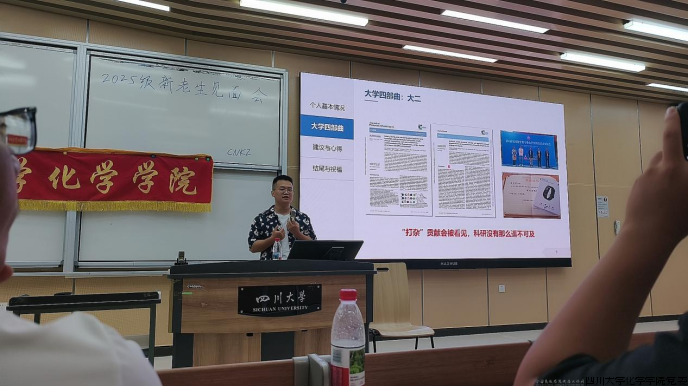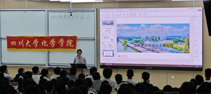 9月9日下午,四川大学化学学院2025级新老生见面会在江安校区综合楼C307顺利举行。此次见面会由四川大学化学学院学生会学习部主办,化学学院本科、博士研究生优秀学生代表与2025级本科生辅导员张美成老师应邀出席,化学学院本科2025级全体同学参加了本次见面会。