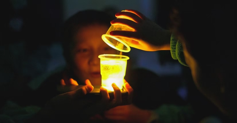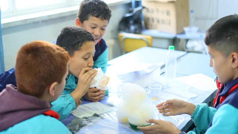 在“生活实验室:用日常材料解锁科学密码”主题课程上,孩子们化身“小小科学家”。“特工密信”环节,大家用维生素C溶液写下“我爱科学”,晾干后涂碘酒,字迹显现时课堂响起阵阵惊呼;“彩虹泡泡龙”实验中,涂满颜料的洗脸巾搭配泡泡水,吹出串串彩色泡泡;“大象牙膏”实验里,过氧化氢溶液在催化剂作用下涌出泡沫,研支团趁机讲解反应原理;最后的“荧光流星雨”实验,黑暗中维生素B₂粉末入水发光,孩子们轻声许下“要当科学家”的愿望。
