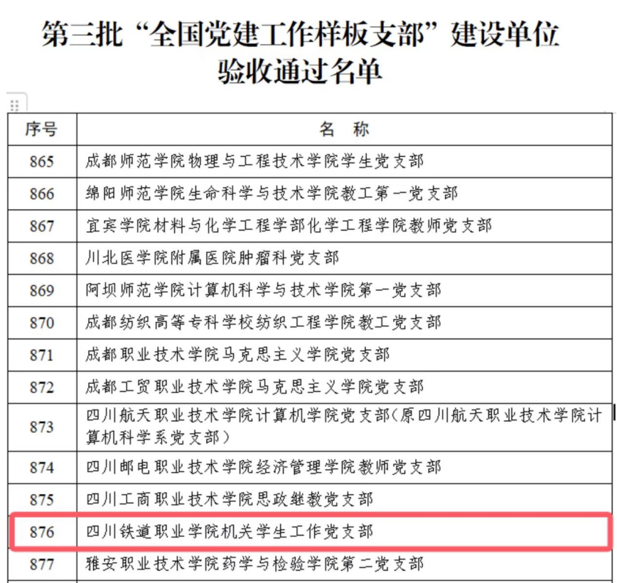 近日,教育部办公厅公布了第三批新时代高校党建示范创建和质量创优工作验收结果,四川铁道职业学院机关学生工作党支部经过对标自查总结、省级党委教育工作部门把关审核、教育部思想政治工作司审查,顺利通过验收。
