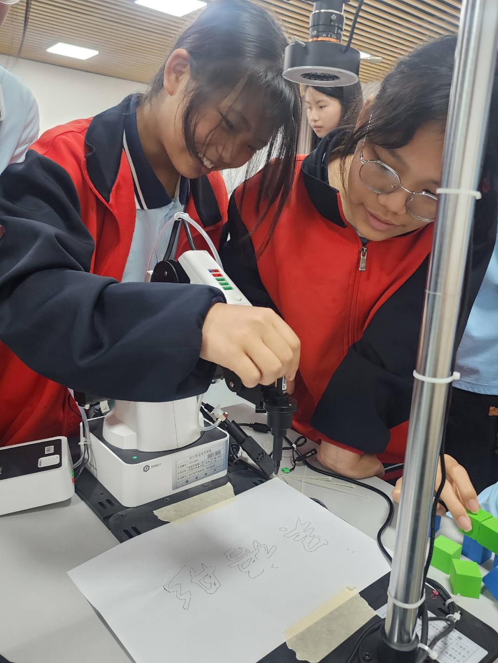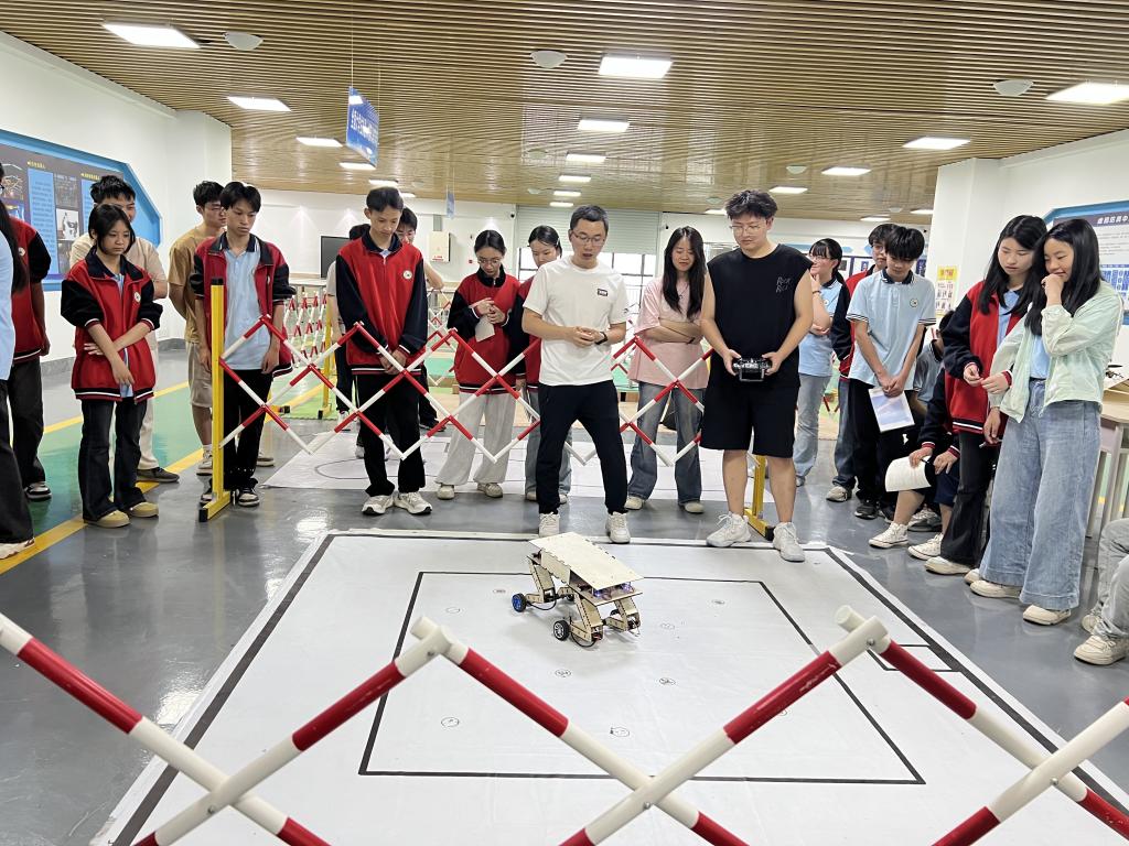 在机器人成果展示区,十余项自主研发的科技成果成为全场焦点。仿生蝴蝶以每秒5次的振翅频率在空中划出优美弧线,其仿生学设计与精准控制系统引得同学们惊叹连连;四足机器人实现灵活运动控制,展现“自动避障”的智能算法;水下机器人搭载水质监测模块,实时传回实验湖的生态数据;水面无人船通过GPS自动巡航,让体验者化身“航海探险家”......最受欢迎的工业机械臂展台前,同学们在大学生指导下亲手编程,操控机械臂完成抓取、码垛等任务。“原来工厂里的‘钢铁手臂’是这样工作的!”一名学生兴奋地表示。