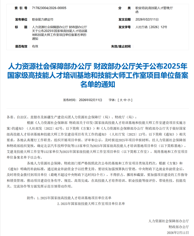 近日,人力资源社会保障部、财政部联合印发《关于公布2025年国家级高技能人才培训基地和技能大师工作室项目单位备案名单的通知》(人社厅函〔2026〕12号),正式公布本年度国家级技能大师工作室建设项目单位名单。我院教师支部刘宝锺老师申报的“刘宝锺技能大师工作室”凭借扎实的技术积累、突出的育人成效和显著的产教融合成果,成功获批国家级技能大师工作室。这是学校在高技能人才平台建设方面取得的又一重大突破,标志着我校在高技能人才队伍建设、产教深度融合及技术创新服务平台构建上迈上新台阶,正式迈入国家级技能人才培养高地行列。