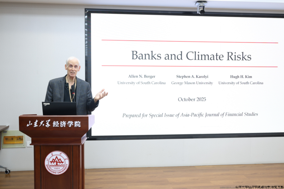 主旨演讲环节由张群姿教授、南开大学金融学院院长范小云教授和山东大学经济学院常东风教授共同主持。Allen Berger教授以“Banks and Climate Risks”为题,从气候风险的物理与转型两个维度分析其对全球金融体系的影响;胡金焱教授以“金融治理伦理的启示”为题,探讨了金融治理与中华优秀传统文化的融合路径;曹廷求教授则围绕“结构性产出缺口与货币信贷政策新功能”进行了深入阐述。