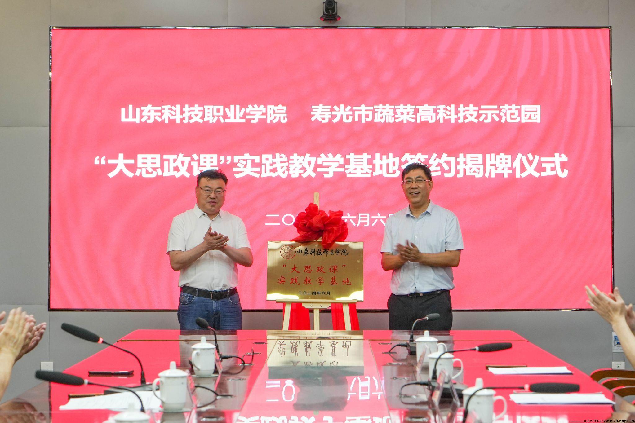 6月6日,山东科技职业学院“大思政课”实践教学基地揭牌仪式在寿光市蔬菜高科技示范园举行。学校党委委员、副校长董传民、寿光市蔬菜高科技示范园管理服务中心党组书记、主任燕黎明出席活动,思政课教学部负责人及师生代表共同见证签约揭牌仪式。