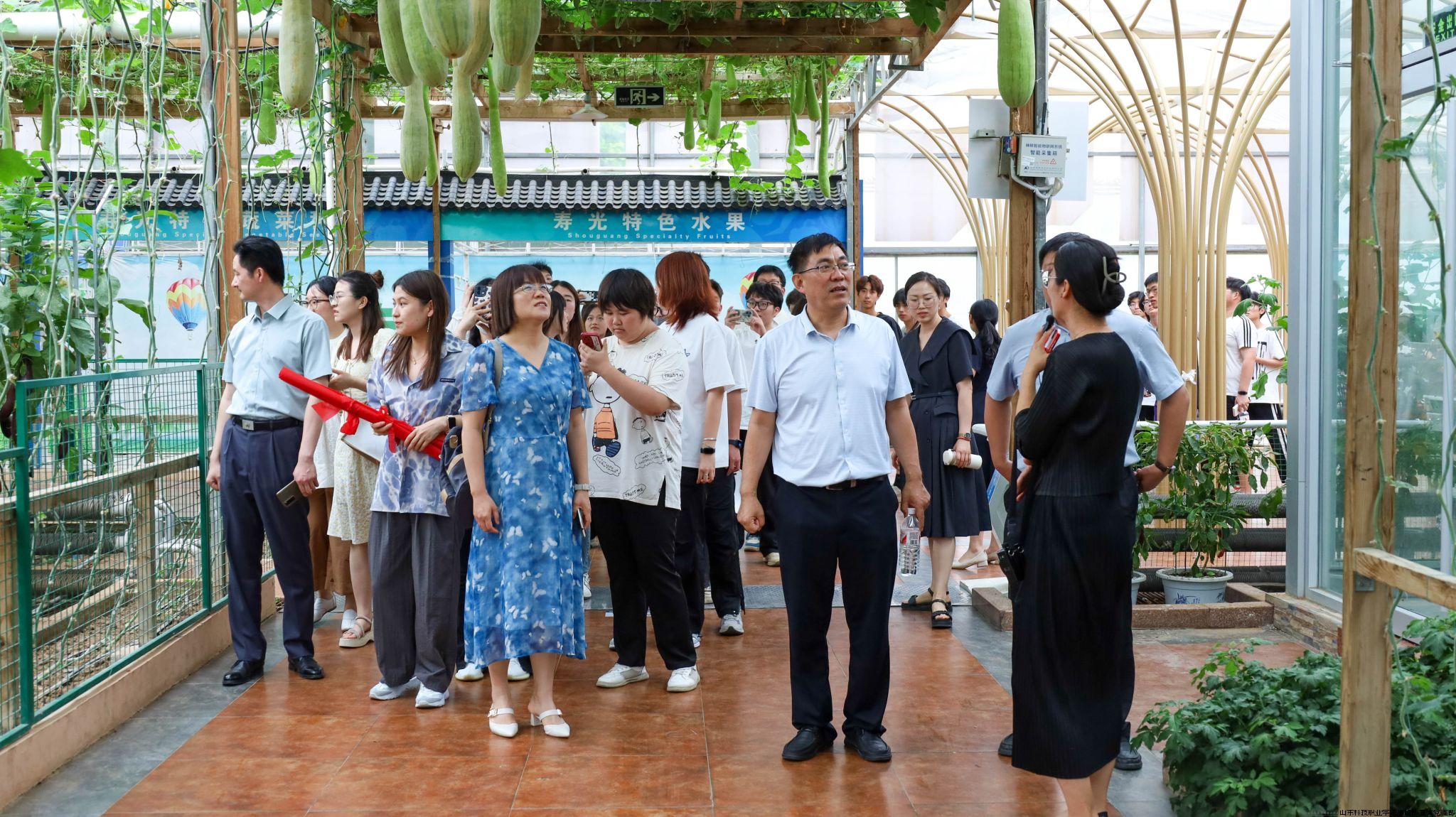 揭牌仪式后,在园方人员的引导下,师生共同参观了园区的5号、7号、8号、10号馆,欣赏了由诸多农作物摆放而成的大型蔬菜景观,了解到水肥一体化、人工补光、菌土壤修复等多项新技术,沿路廊架园艺特色和硕果累累的景象让师生赞叹不已,近距离感受了科技创新推动农业发展的力量。
