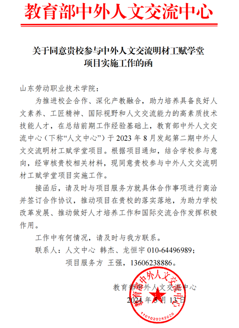 为深入学习党的二十大精神,贯彻落实《中办国办关于加强和改进中外人文交流工作的若干意见》《教育部等八部门关于加快和扩大新时代教育对外开放的意见》等文件要求,教育部中外人文交流中心于2023年8月发起实施第二期“中外人文交流明材工赋学堂”项目。“中外人文交流明材工赋学堂”以人文交流理念为指导,精准对接企业用人需求以及高等院校的专业建设和人才培养需要,深化校企合作,旨在培养更多具备良好人文素养、工匠精神、国际视野和人文交流能力的高素质技能人才,服务于教育对外开放、教育高质量发展和教育强国建设。
