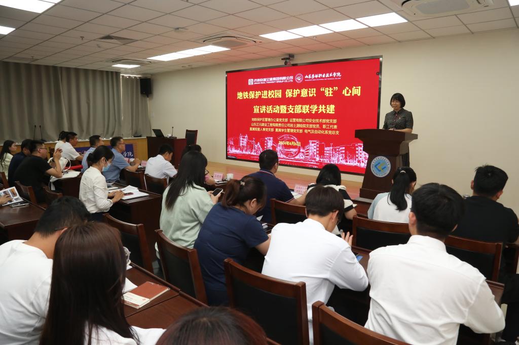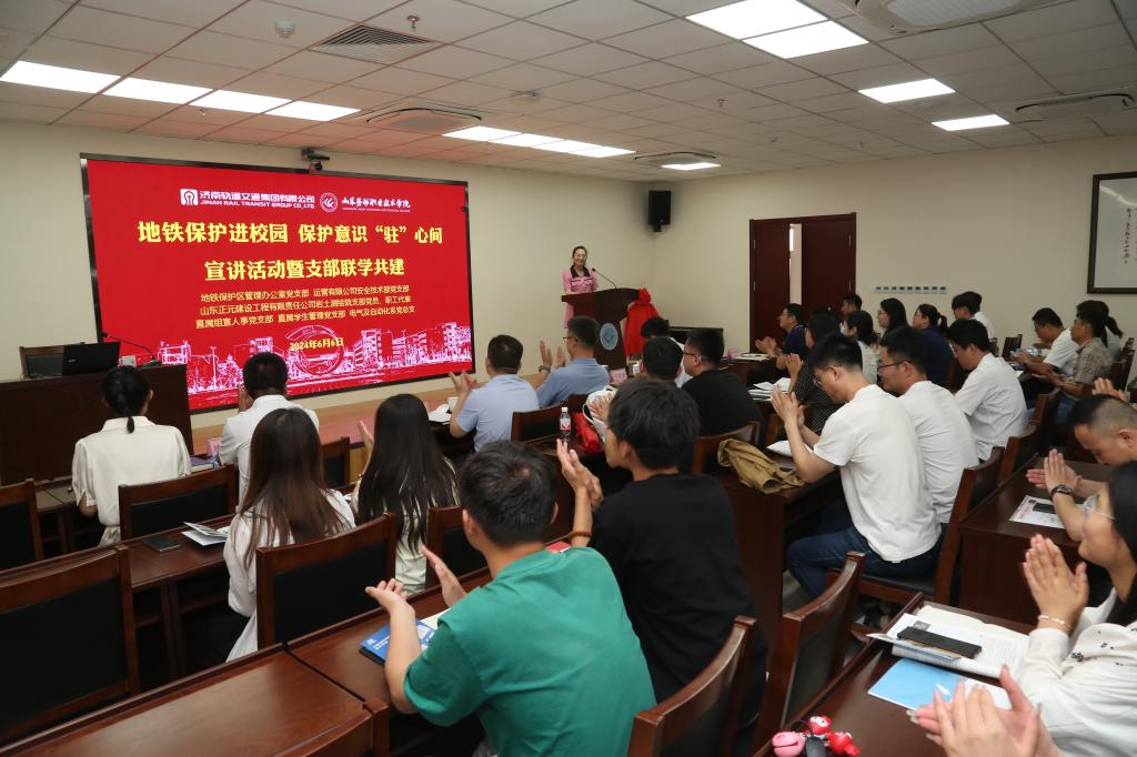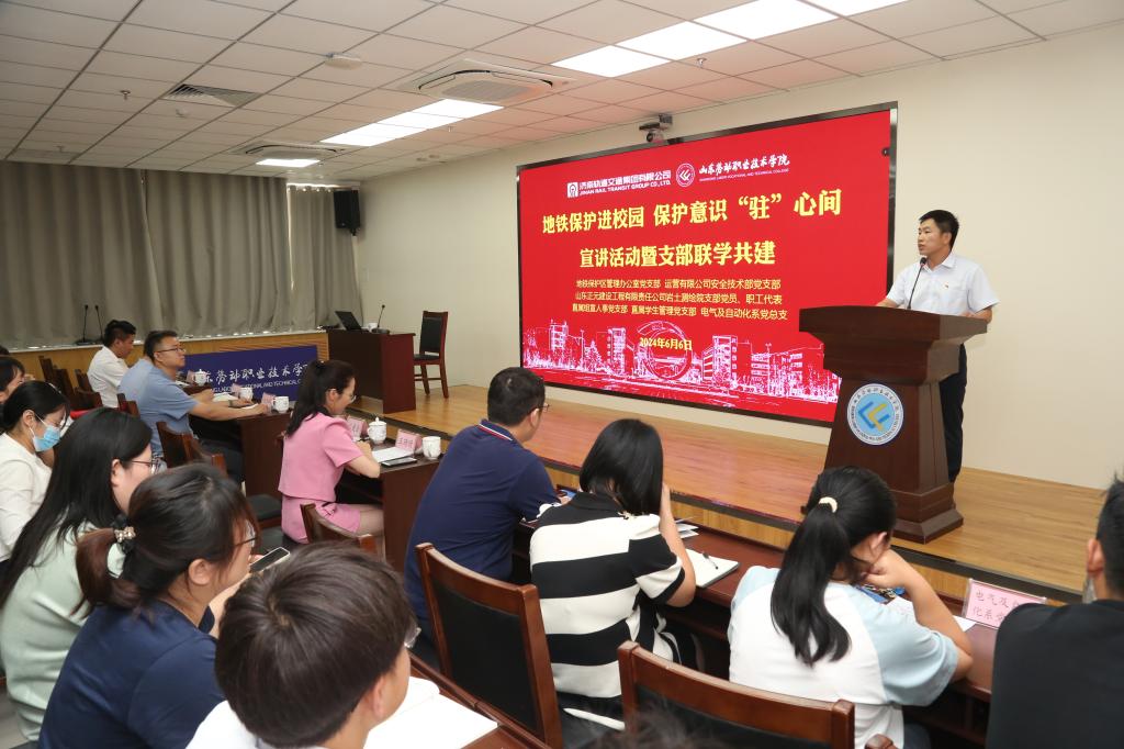 6月6日下午,学院直属组宣人事党支部、直属学生管理党支部、电气及自动化系党总支与济南轨道交通集团地铁保护区管理办公室党支部、运营有限公司安全技术部党支部,山东正元建设工程有限责任公司岩土测绘院支部联合开展“地铁保护进校园,保护意识‘驻’心间”宣讲暨支部共建活动。济南轨道交通集团地铁保护区管理办公室主管张冬冬,山东正元建设工程有限责任公司岩土测绘院副院长吴玉涛、经营管理部经理陈允斌,山东劳动职业技术学院党委委员、宣传部部长宋爱全出席活动。活动由宣传部副部长、直属组宣人事党支部副书记王晴晴主持。