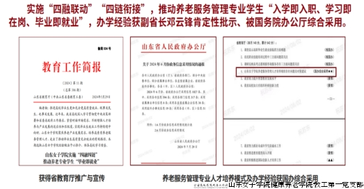 在学校教育中,注重打造“大思政课”,将思政教育与社会实践相结合,让学生在服务地方教育事业的过程中,增强社会责任感和使命感,培养正确的世界观、人生观和价值观。学院人才培训模式被央视新闻1+1、《光明日报》、新华网等30多家媒体报道,获国家总理李强和山东省副省长邓云锋肯定性批示,山东省教育厅发布了《山东女子学院实施“四融四链”推动养老服务管理专业学生“毕业后即就业”》的教育简报,被国务院办公厅综合采用。