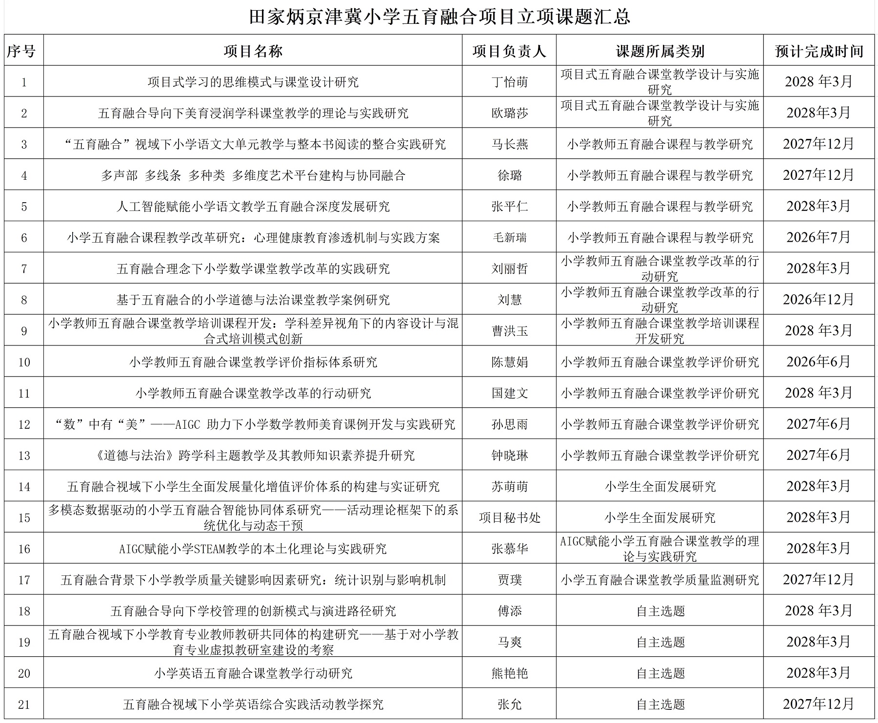 这批立项课题立足实际教学需求,具有良好的现实意义与推进价值。预期成果将围绕课堂实践、师资培养、学生发展及技术应用等方面,形成一批可供参考的教学案例、培训方案及评价工具,为京津冀实验项目校教师落实五育融合提供切实支持,助力小学五育融合走向深入、可持续的教育实践。