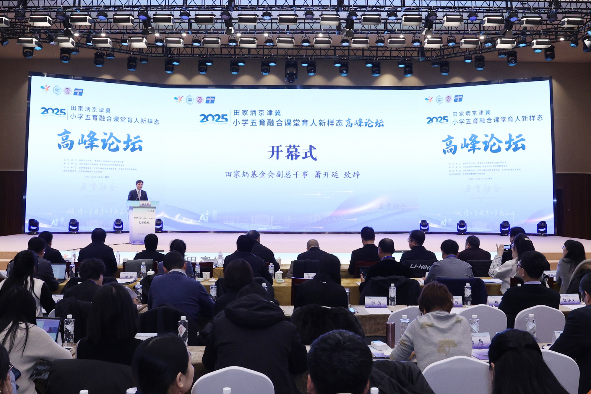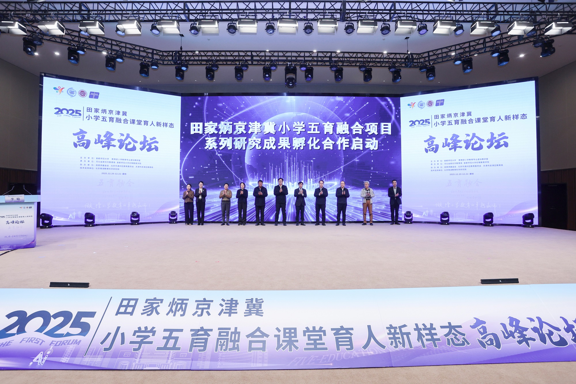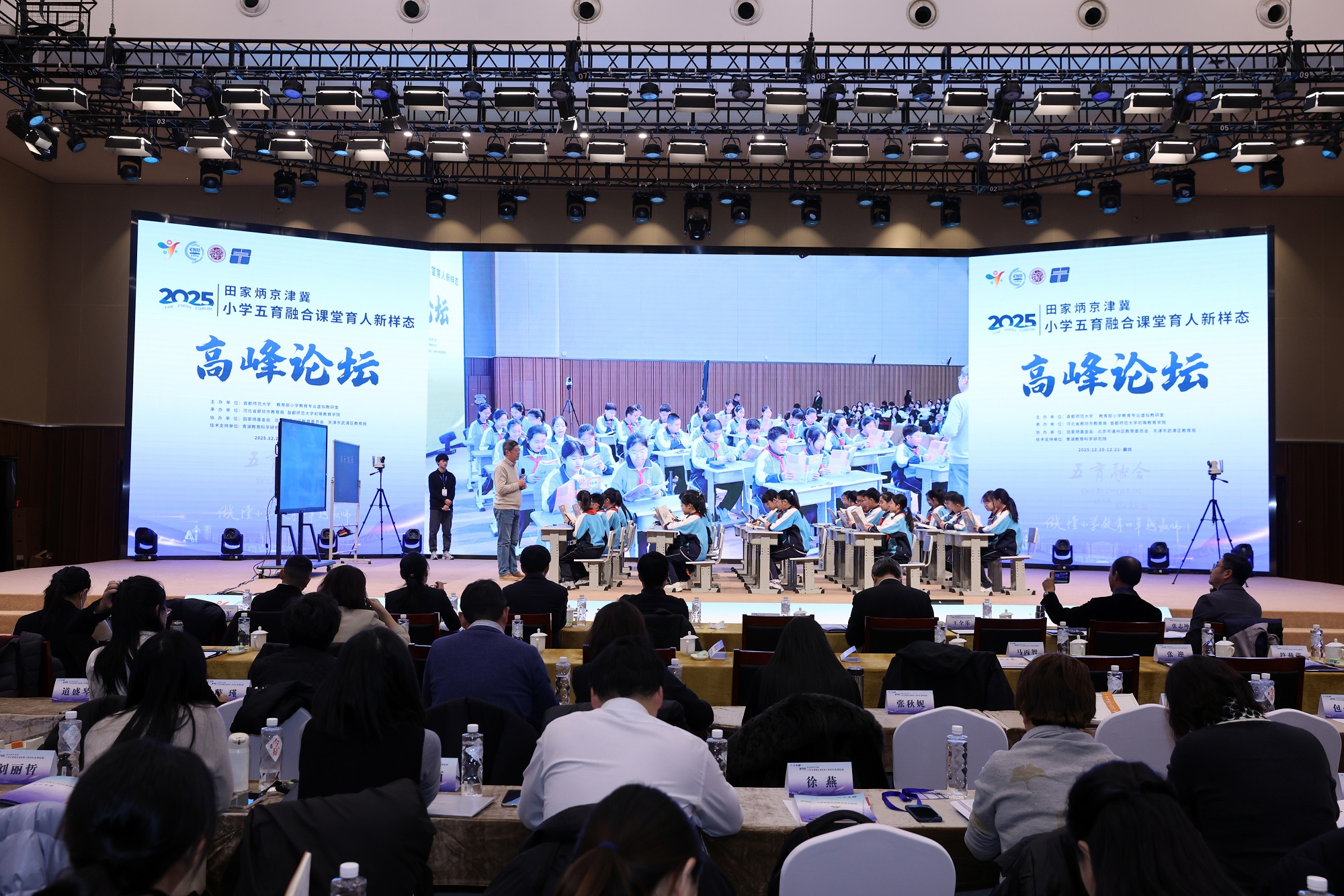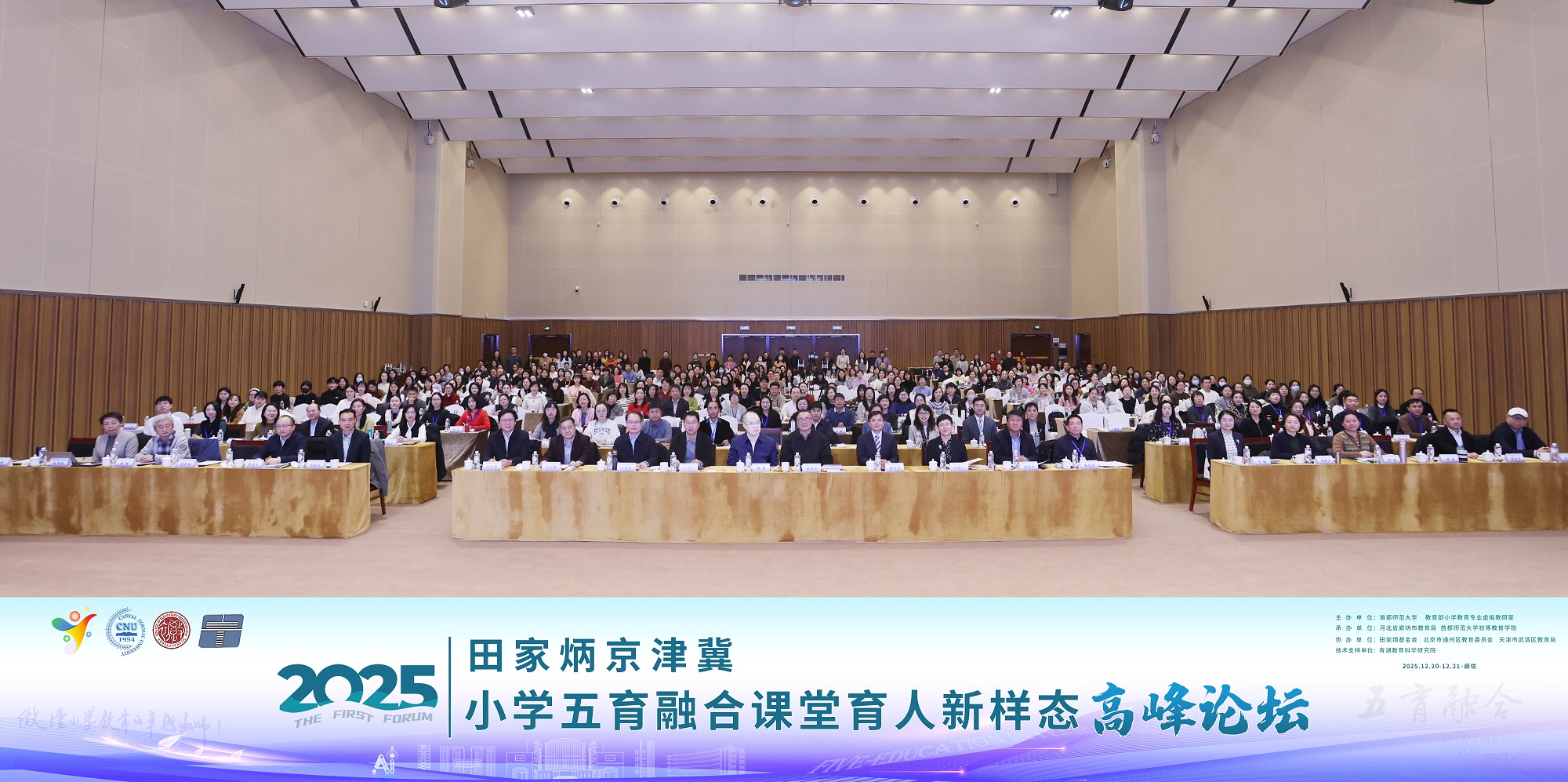 12月20日至21日,“2025田家炳京津冀小学五育融合课堂育人新样态高峰论坛”在河北省廊坊市京津冀大数据创新应用中心成功举行。本次论坛由首都师范大学、教育部小学教育专业虚拟教研室主办,河北省廊坊市教育局、首都师范大学初等教育学院承办,田家炳基金会、北京市通州区教育委员会、天津市武清区教育局协办,青湖教育科学研究院提供技术支持,吸引了教育行政部门、高等院校、京津冀一线小学及出版机构等多方代表参与,共同围绕小学阶段五育融合的课堂实践与未来发展方向展开经验交流与深度研讨。