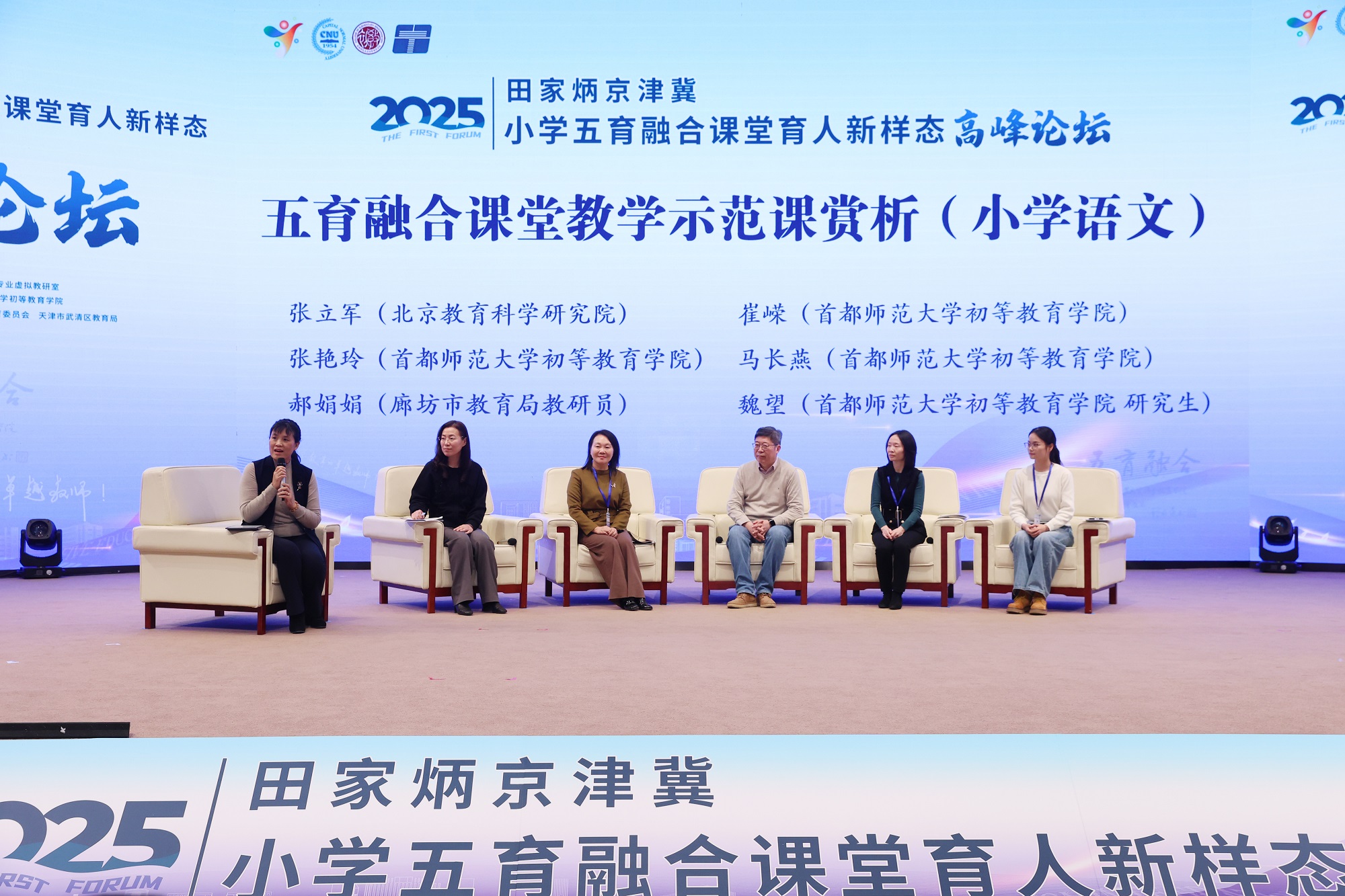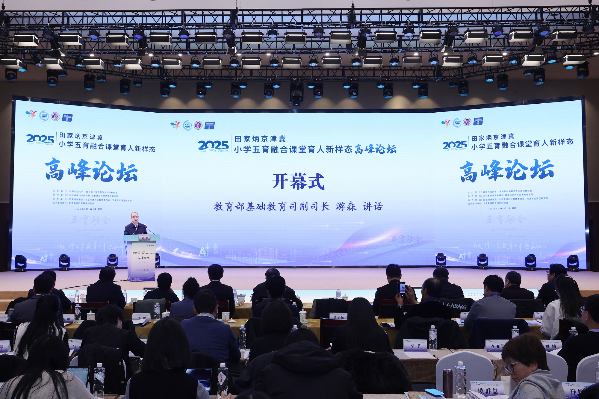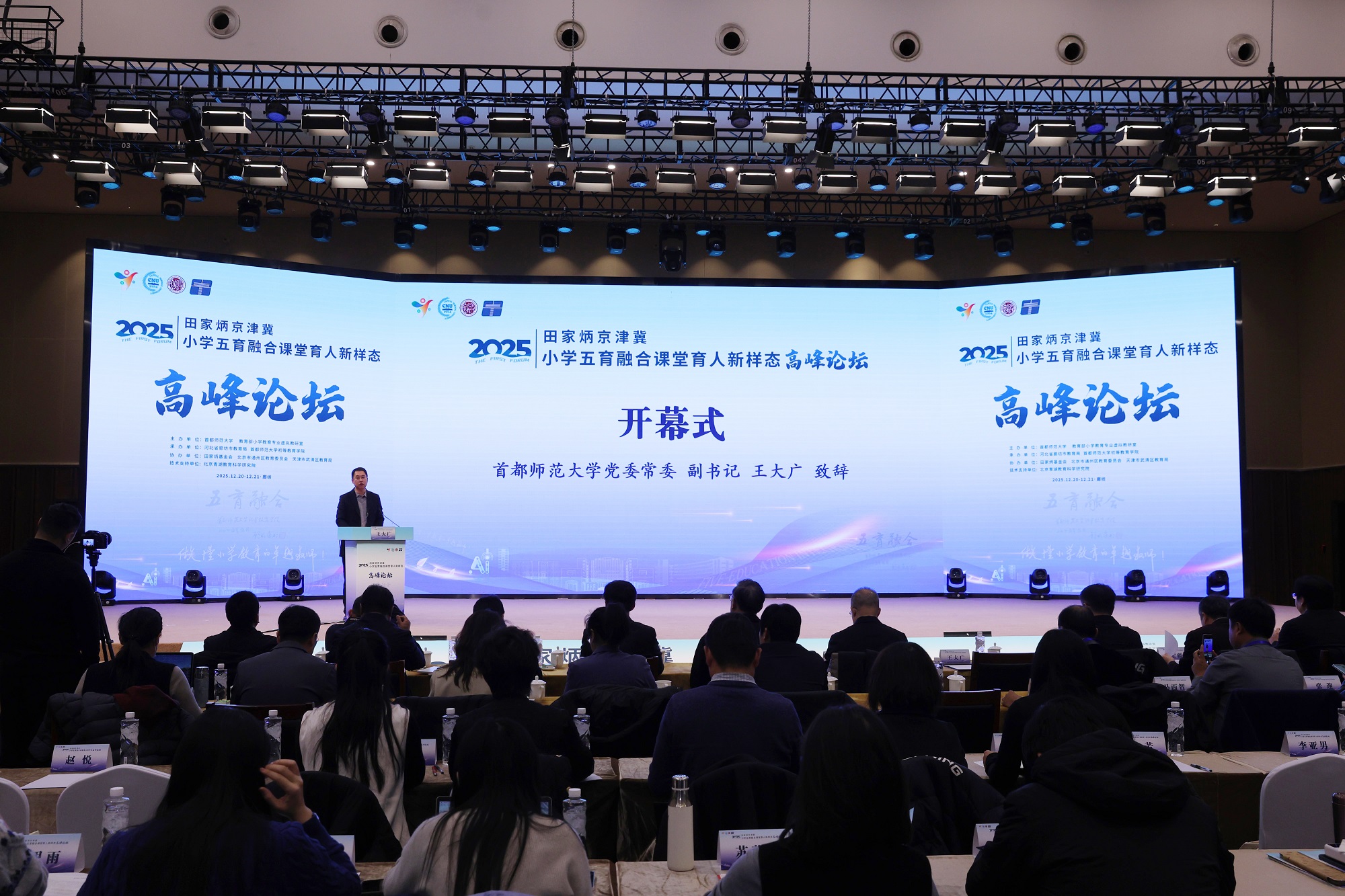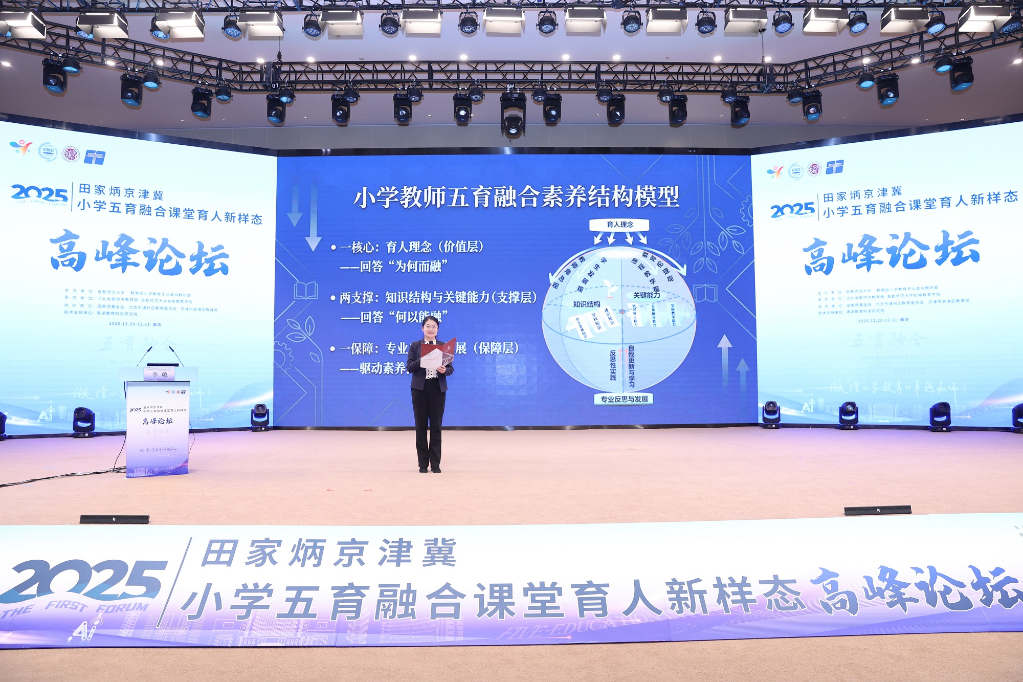 12月20日至21日,“2025田家炳京津冀小学五育融合课堂育人新样态高峰论坛”在河北省廊坊市京津冀大数据创新应用中心成功举行。本次论坛由首都师范大学、教育部小学教育专业虚拟教研室主办,河北省廊坊市教育局、首都师范大学初等教育学院承办,田家炳基金会、北京市通州区教育委员会、天津市武清区教育局协办,青湖教育科学研究院提供技术支持,吸引了教育行政部门、高等院校、京津冀一线小学及出版机构等多方代表参与,共同围绕小学阶段五育融合的课堂实践与未来发展方向展开经验交流与深度研讨。