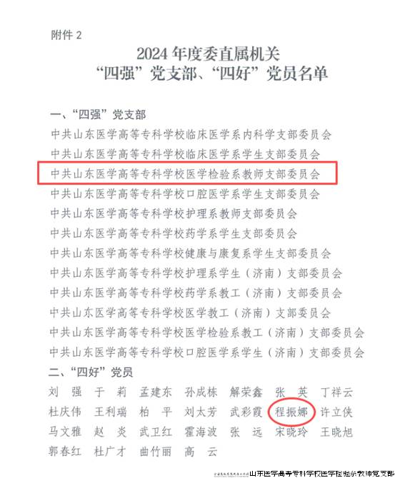 近日,山东省委省直机关工委公布了2024年度委直属机关“四强”党支部和“四好”党员名单,医学检验系教师党支部等12个党支部被认定为“四强”党支部,医学检验系教师程振娜获评省直机关“四好”党员。