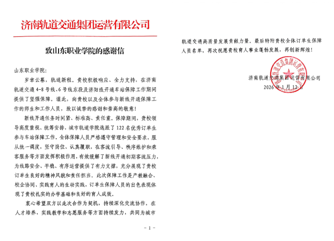 1月12日,我校收到了济南轨道交通集团运营有限公司的感谢信,信中对我校参与新线开通保障工作的师生和工作人员表示感谢。