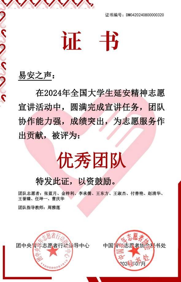 在2024年度的社会实践与志愿服务活动中,易安书院第一党支部组织的“正青春”实践队、‘‘红韵沂蒙·筑梦前行’’暑期社会实践队与易安书院“绘声”宣讲团、“易安之声”宣讲团均获嘉奖。