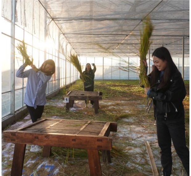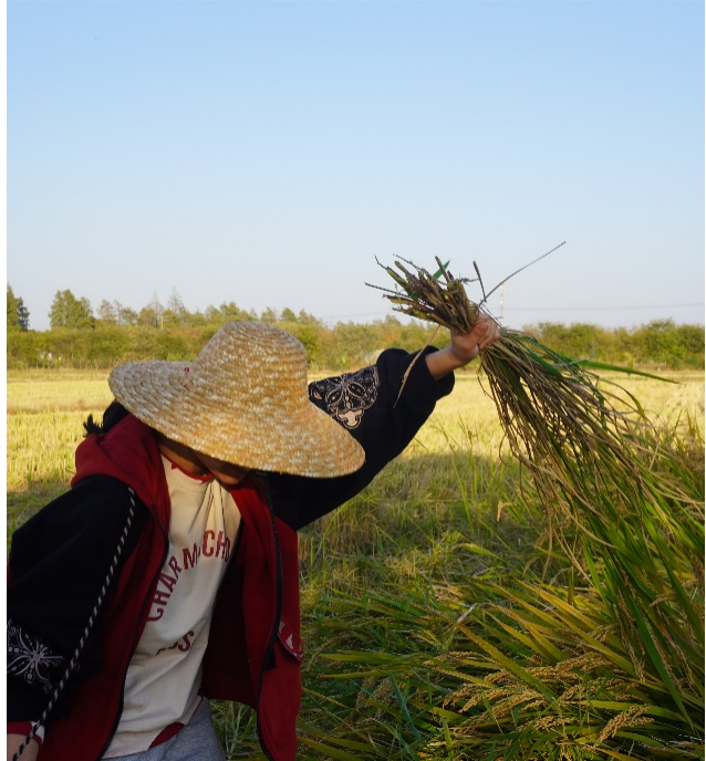 土法打谷是传统农事的重要组成部分,需要农人握住收割完毕的稻谷,在特制的竹筛上进行敲打。在一次又一次的碰撞中,成熟的稻谷便通过竹筛的网眼流入下方的收纳袋里。在活动进行的过程中,温暖的夕阳洒在金黄的稻田上,支部所有同志全身心地投入到收割和打谷的过程中,用心去体验秋收的喜悦。