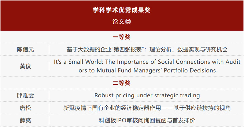 日前,上海市哲学社会科学优秀成果奖评委会审议公布了第十七届哲学社会科学优秀成果奖拟获奖公示名单,会计学院5位教师入选“学科学术优秀成果奖”。其中,本支部党员陈信元教授获“论文类”优秀成果一等奖;薛爽教授获“论文类”优秀成果二等奖。