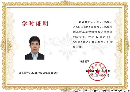 为深入学习贯彻习近平新时代中国特色社会主义思想,全面落实新时代党的建设总要求和《全国党员教育培训工作规划(2024—2028年)》,固体所党支部书记郭战胜同志积极参加了2025年全国高校基层党组织书记网络培训示范班。郭战胜同志已于8月4日前顺利完成全部学习任务和在线自测考试,成绩合格,获得培训电子证书。