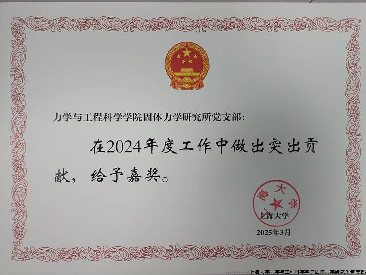 在力学与工程科学学院2025年表彰中,固体力学研究所党支部荣获上海大学嘉奖。