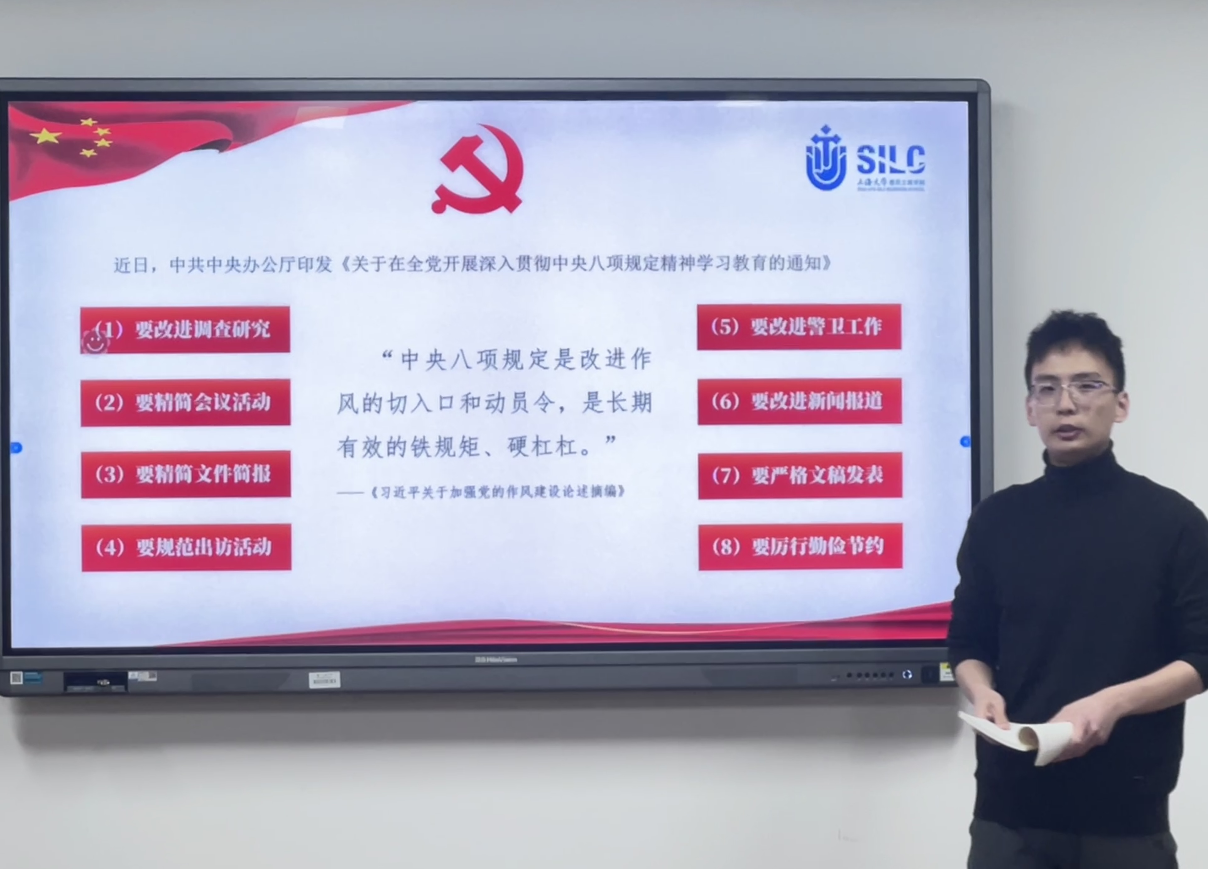 本月,中共中央办公厅印发《关于在全党开展深入贯彻中央八项规定精神学习教育的通知》。陈作霖同志带领与会党员一同学习《习近平关于加强党的作风建设论述摘编》中有关中央八项规定的重要论述。