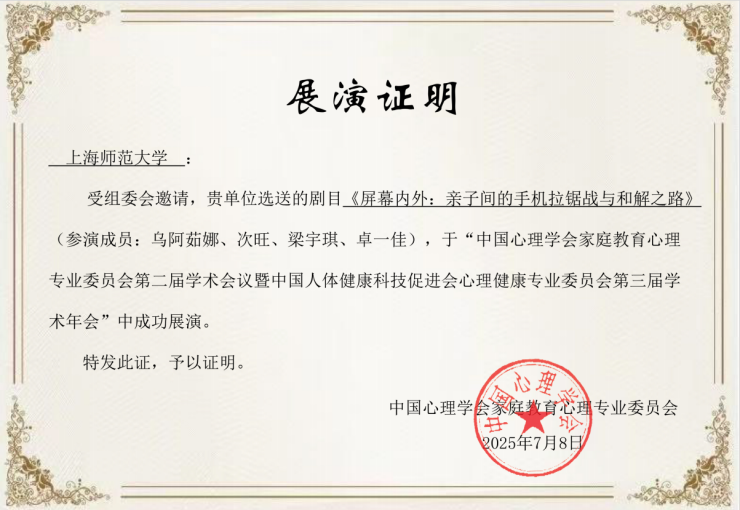 在7月8日下午举行的家庭教育系列创意展演环节中,我院乌阿茹娜副教授带领研究生次旺、梁宇琪、卓一佳精心编排的家庭教育情景剧《屏幕内外》精彩亮相。该剧通过论坛剧场的形式,生动演绎了如何在中小学家庭教育工作中化解由手机使用引发的亲子冲突。剧中孩子、父亲与母亲围绕屏幕设备的故事,巧妙融入了家庭教育与心理健康元素,引发观众强烈共鸣,赢得了广泛好评。