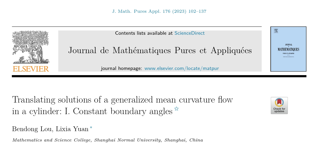 近日,我校数理学院娄本东教授研究团队在国际数学期刊《Journal de Mathématiques Pures et Appliquées》(纯粹数学与应用杂志)上发表了题为《Translating solutions of a generalized mean curvature flow in a cylinder: I. Constant boundary angles》的学术论文。该期刊由刘维尔于1836年创刊,是世界上第2古老的数学期刊,是中国数学会选定的27个T1期刊之一,致力于发表纯粹与应用数学领域的突破性成果,具有很高的学术声誉。