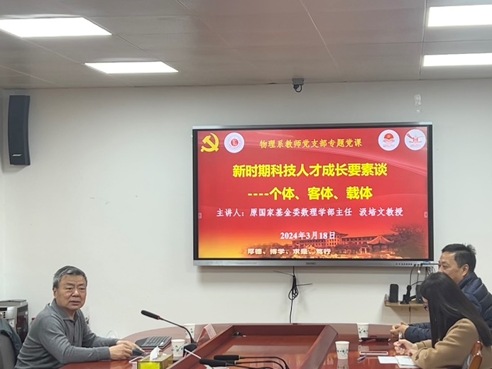 2024年3月18日下午,物理系教师党支部在10号楼222举行了“科学家精神”以及最新科研相关政策座谈会,原国家自然科学基金委数理学部主任汲培文应邀参加了座谈会并做了专题党课报告。数理学院党委书记樊连生、原数理学院院长石旺舟以及物理系教师和学生代表等30余人参加了此次座谈会,会议由数理学院副院长、物理系教师党支部书记林方婷同志主持。