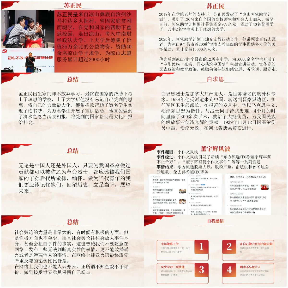 代班主持杨阿拾同学为大家讲述的是最美大学生苏正民和革命先烈白求恩的事迹。范正民虽出生寒门,却从未放弃学习,最终在国家的帮助下考上了理想的学校,上了大学后他没有忘记自己受到的恩惠,将自己的力量最大化,筹集捐款帮助了数名学生实现了读书梦,为万名学生开展了宣讲活动,做到了滴水之恩涌泉相报,将自身受到的国家的帮助最大化回报给社会。