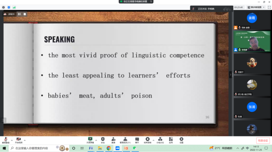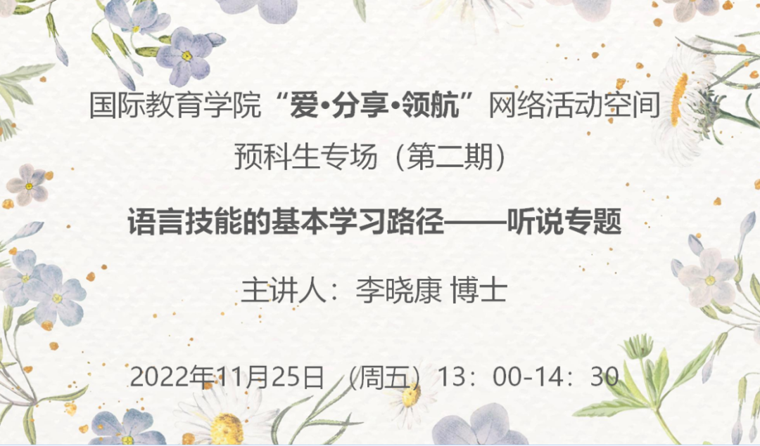 2022年11月25日下午13:00,国际教育学院继续开展了“爱·分享·领航”的系列讲座活动,本次主题是“语言技能的基本学习路径——听说专题”。本次讲座国际教育学院教师李晓康博士担任主讲人。在日常学习生活中,很多同学都会遇到有关学习外语的困难,如何去解决这些困难,对于同学们来说是比较困难的。本次讲座主要围绕同学们在学习语言过程中遇到的问题展开,帮助同学们走出“学习困境”,掌握语言学习的基本路径。
