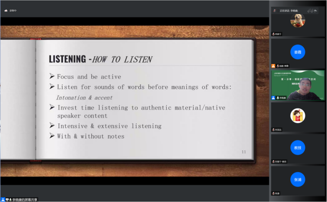 在本场分享的第二部分——口语学习环节,李老师指出同学们应努力克服不敢张口去“说”这一心理障碍,这会成为语言学习之路上的绊脚石。在克服开口说的基础上,如何“说”往往也很重要,李老师分享了“说”的多种形式,比如主动积极发言,找到学伴,对着镜子练习口等多种方式将自己内心所想表达出来。同学们也可以积极参加“英语角”,找到志同道合的“角”伴一起练习口语。李老师鼓励同学们从现在做起,从我做起,慢慢积累,持之以恒必将收获满满。