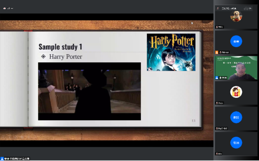 紧接着,李老师分享了《哈利波特》电影里的片段,邀请同学们加入互动。与会同学分享了所理解的视频大意。师生积极互动,气氛十分和谐。然后李老师做出总结,提出了一个新的概念——构词法,方便同学们学习新词汇。
