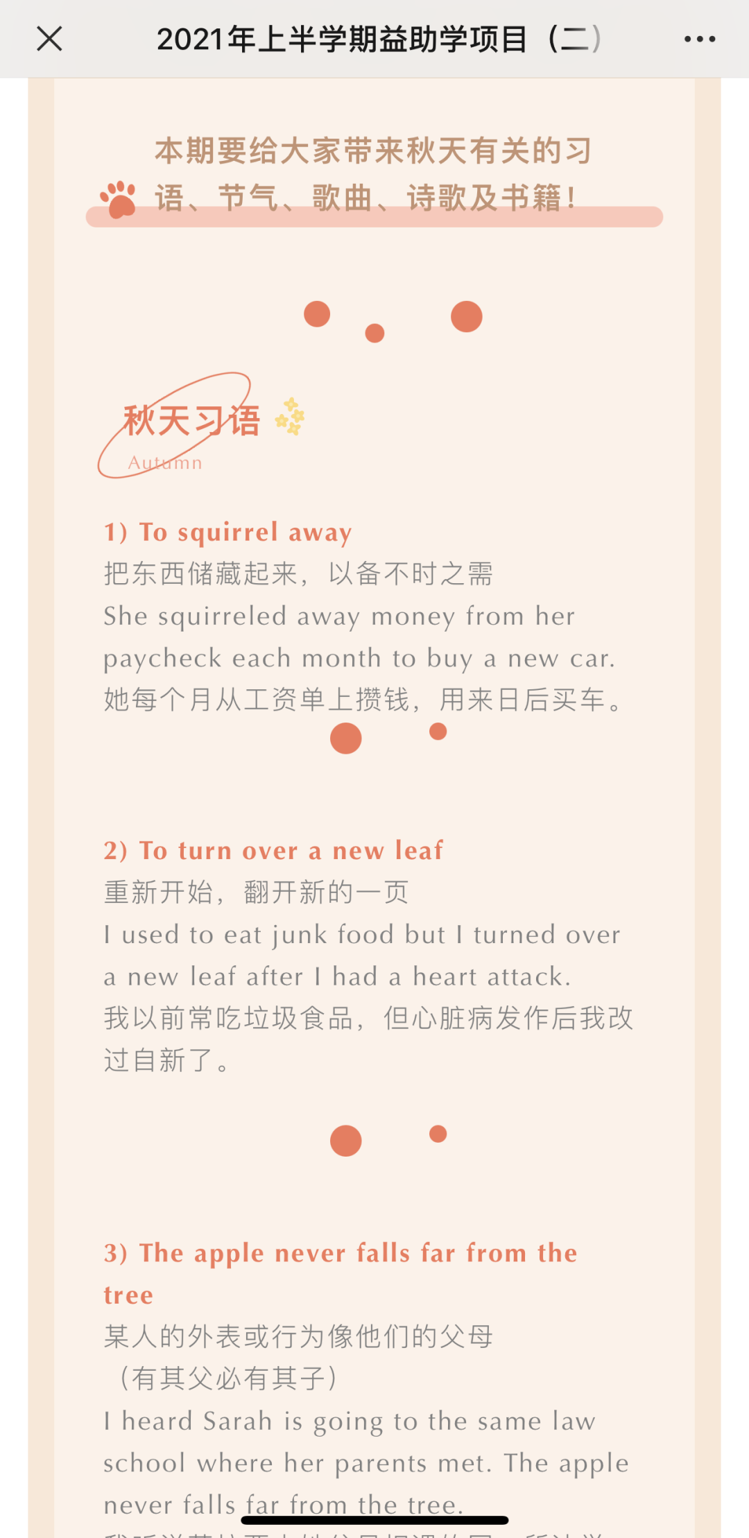 当我得知我将负责讲述有关秋天的书或电影时,我感到有些困难,因为我以前很少关注有关秋天的内容。但通过上网搜索电影片段与相关书籍后,我对秋天有了更深认识,并决定向小朋友们介绍《一片叶子落下来》这个唯美的故事。如果现在有人问我你最喜欢哪个季节?我会毫不犹豫地说:“秋天!”
