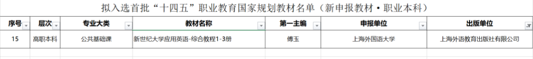 在刚刚结束的“十四五”职业教育国家规划教材评审中,我院傅玉老师编写的《新世纪大学应用英语-综合教程》(1-3期)入选首批“十四五”职业教育国家规划教材公示名单。