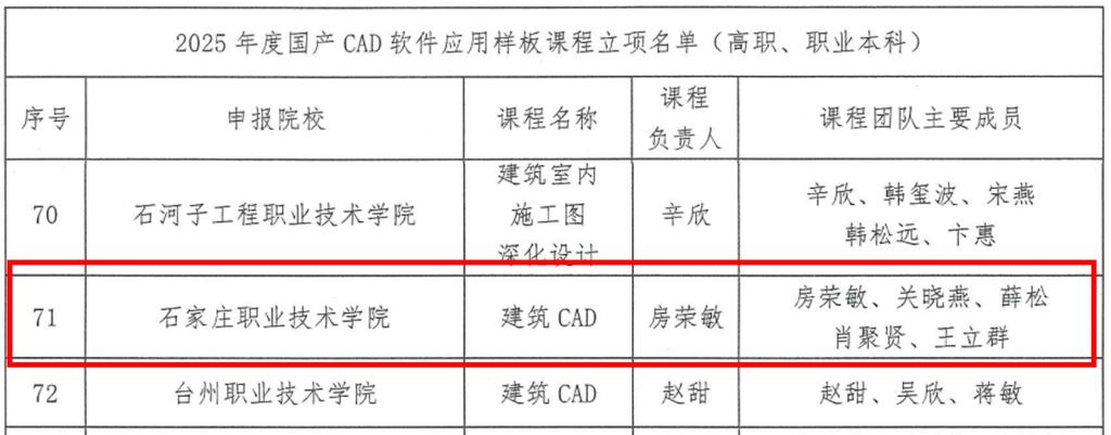 近日,中国建设教育协会正式公布2025年度国产CAD软件应用样板课程立项名单,我院建筑工程系房荣敏老师主持申报的《建筑CAD》课程经严格评审,从全国申报项目中脱颖而出,成功获批立项。此次全国共有124门课程入选,标志着学院在建筑信息化教学领域的实践成果再获国家级权威认可。