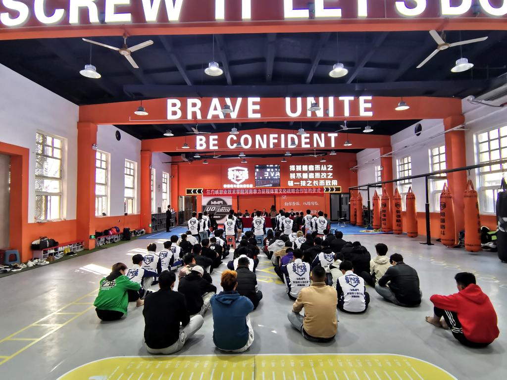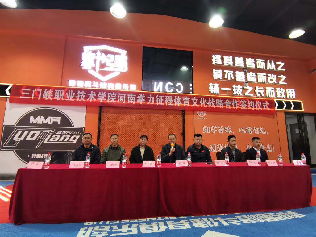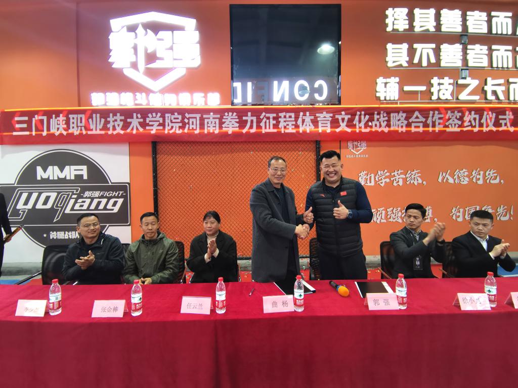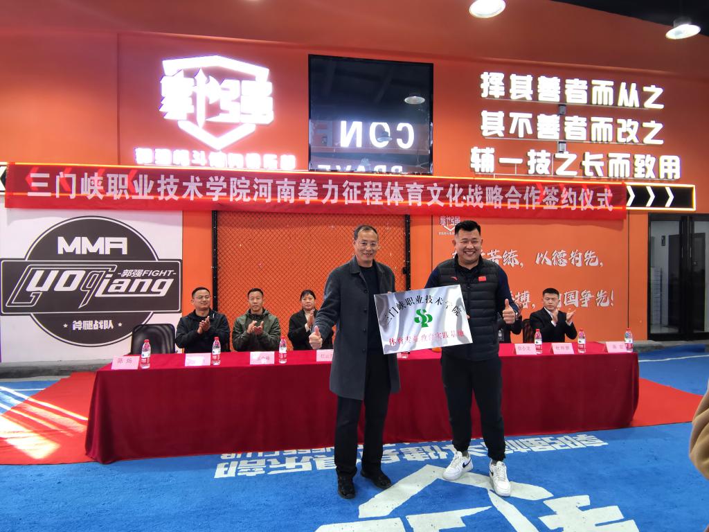 3月20日下午,体育学院院长曲扬一行赴三门峡郭强格斗健身俱乐部,与河南拳力征程体育文化传播有限公司(三门峡郭强格斗俱乐部)签订战略合作框架协议并举办体育专业教育实践基地授牌仪式。体育学院教学工作负责人任云兰、实训科负责人、民族传统体育专业负责人,郭强格斗俱乐部董事长郭强、俱乐部各部门负责人出席仪式,仪式由郭强格斗总经理徐云海主持。