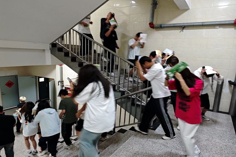 5月11日晚,北校区第四教学楼内响起急促的警报声,化学工程学院地震应急疏散演练正式启动。演练中,学生迅速采取“伏地、遮挡、抓牢”的避震姿势,随后按预定疏散路线撤离至安全区域。全程用时3分28秒,全体参演师生安全抵达集合点。负责老师结合演练情况,重点讲解了室内避震要点及疏散注意事项,并强调“地震逃生需保持冷静,日常熟悉逃生通道至关重要”。