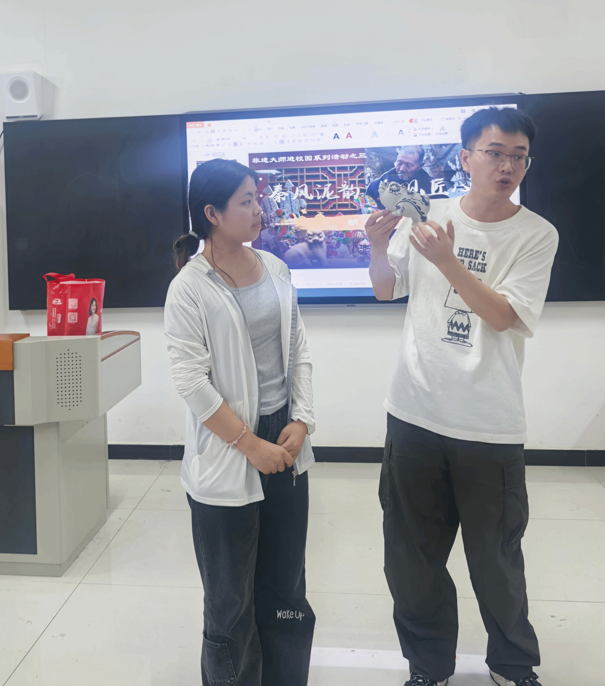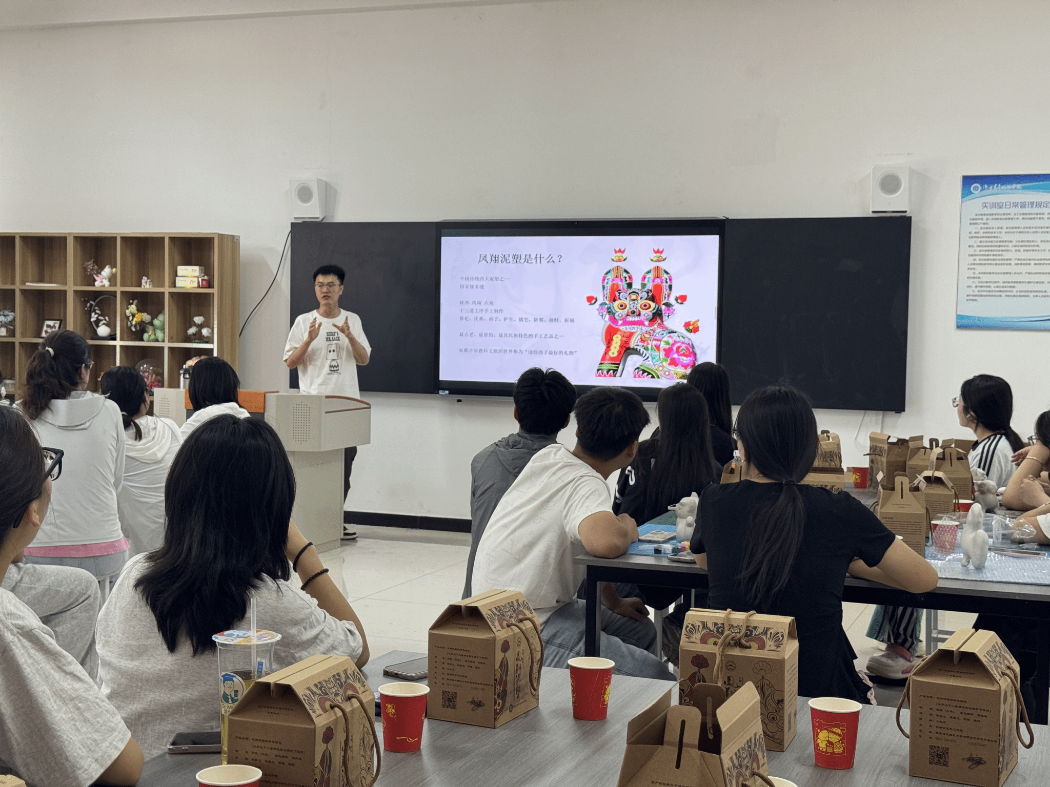 胡锦伟老师生动讲授了凤翔泥塑这一非遗技艺的历史渊源、发展历程以及地域特色。从古老的秦风汉韵中走来的泥塑艺术,承载着无数先辈的智慧与情感,每件作品都蕴含着独特的文化内涵。随着讲解的深入,同学们对泥塑艺术的兴趣愈发浓厚,迫不及待地开启了自己的创作之旅。