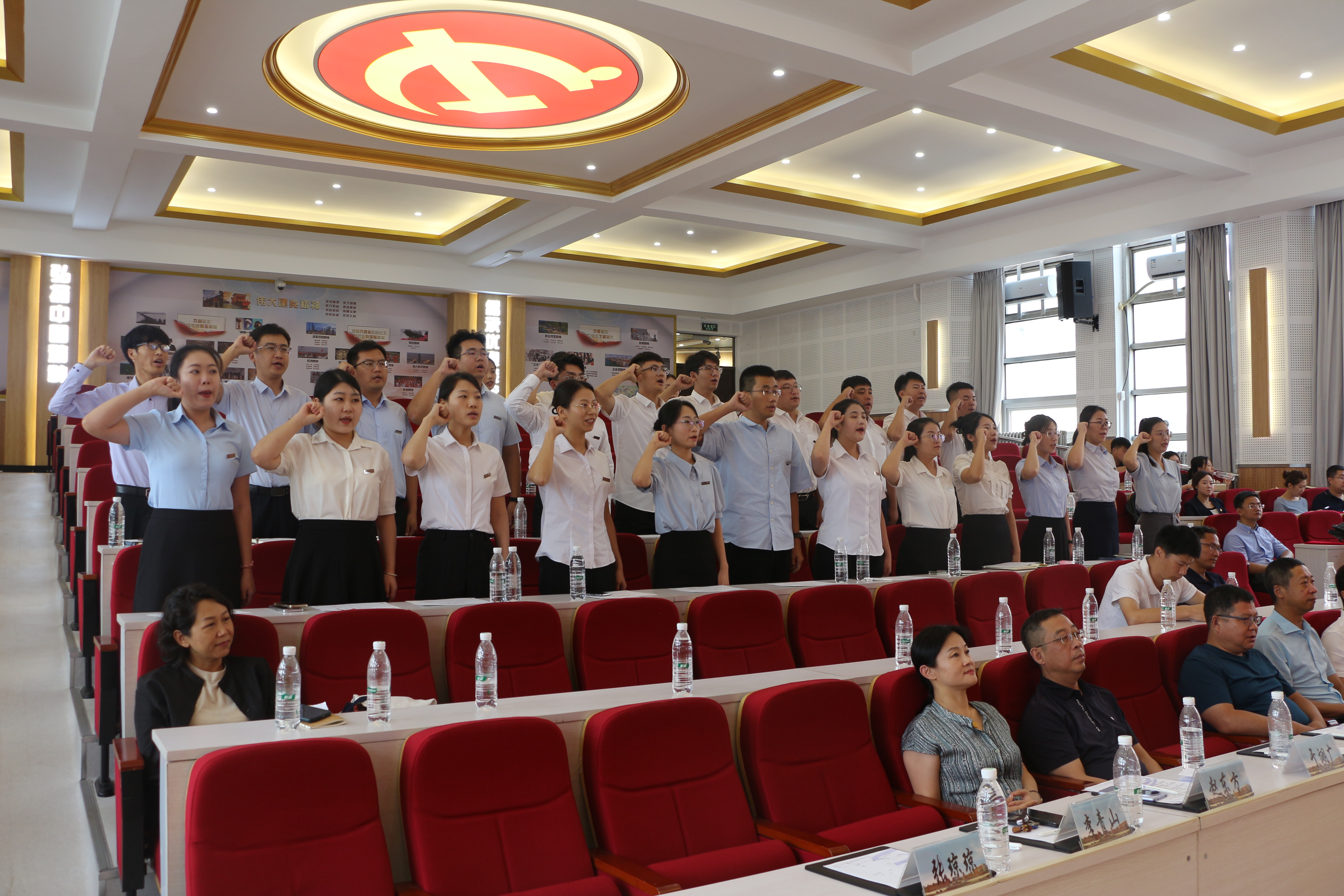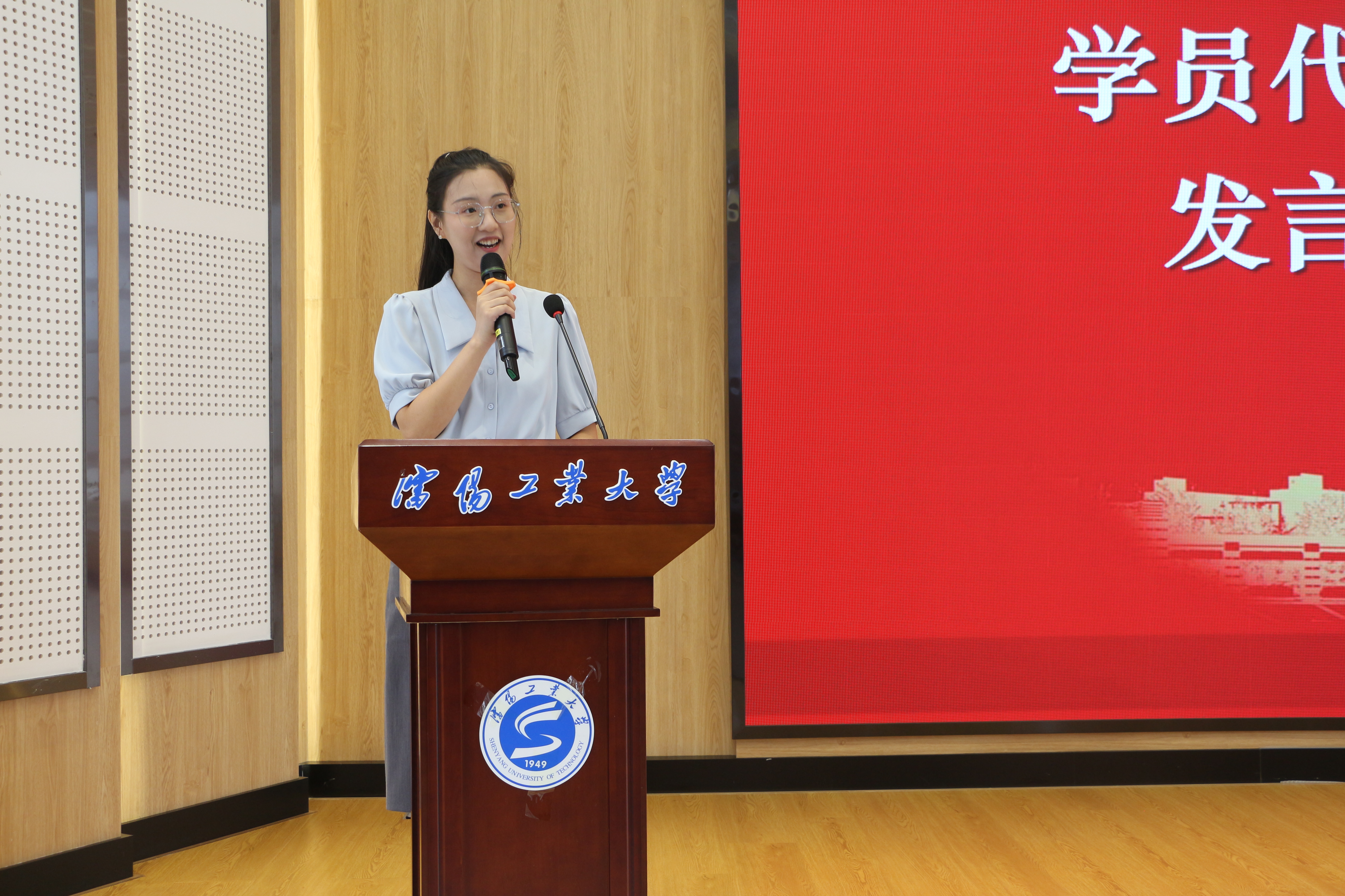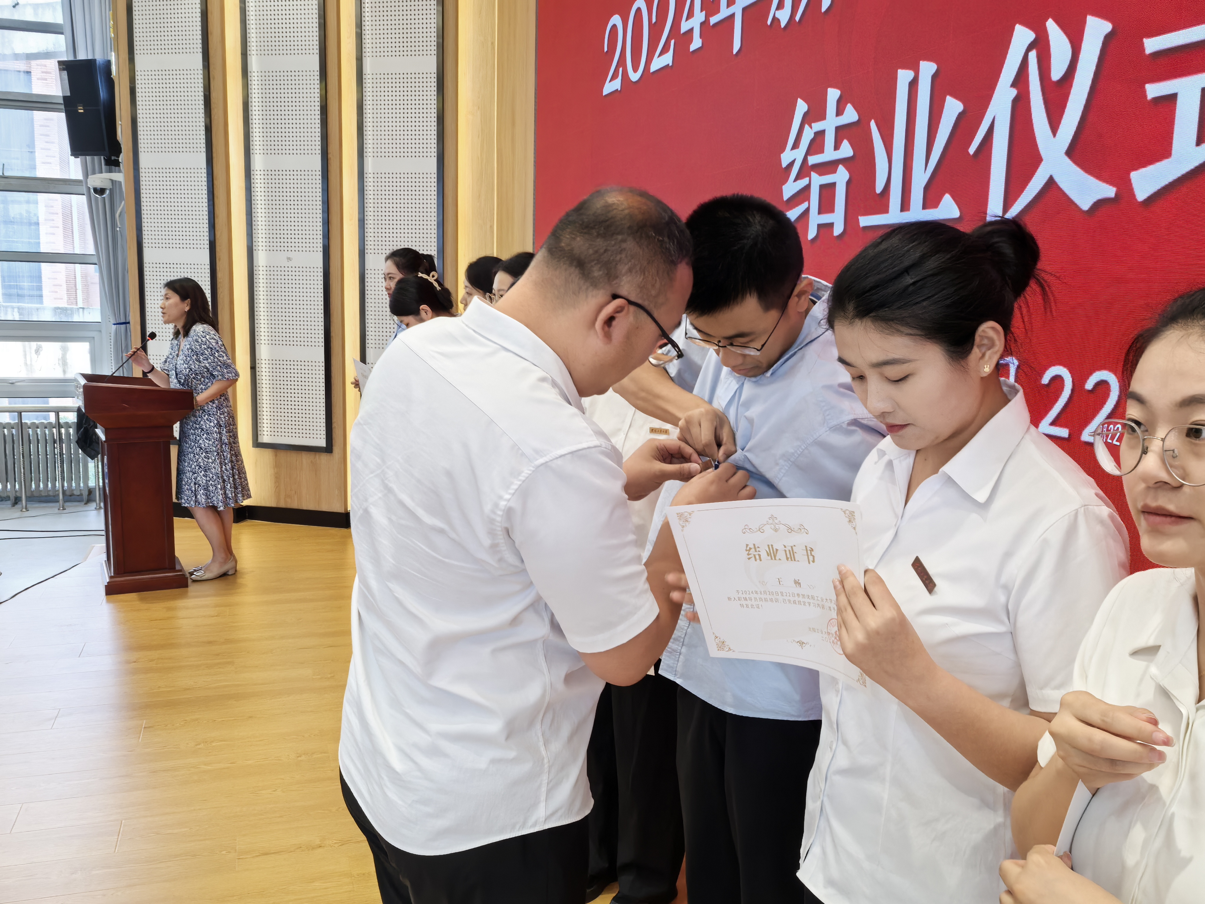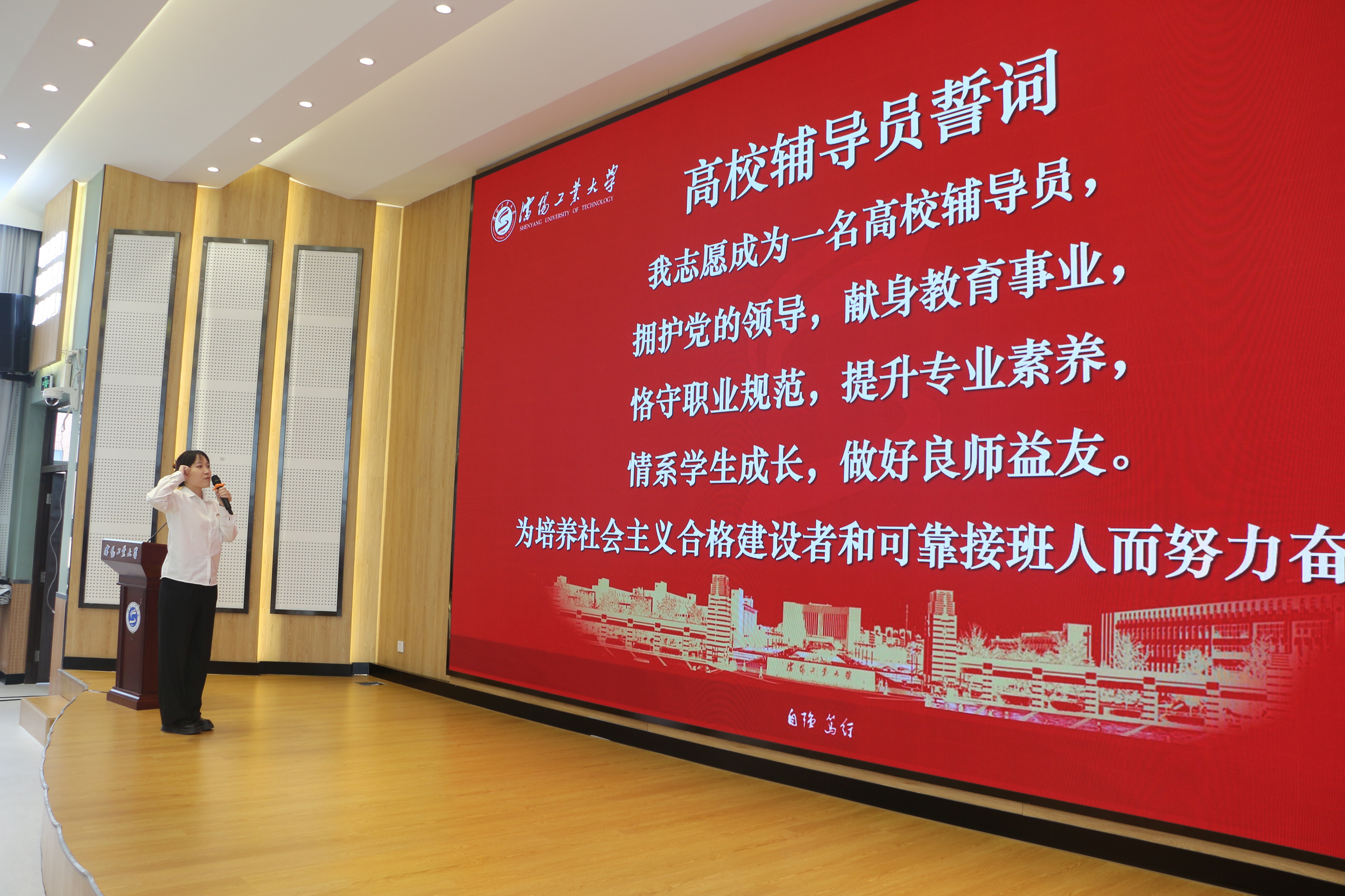 在结业仪式上,学员代表包婉婷、李骁涵作为新入职辅导员代表进行了发言,表达了要将培训收获转化为工作动力的决心!结业仪式上,李青山为每位新辅导员颁发结业证书,佩戴校徽,这一刻,他们正式成为了沈阳工业大学辅导员队伍的一员。在学员代表陶晶的带领下,全体新辅导员庄严宣誓,承诺将不忘初心,牢记使命,为成为大学生的引路人、贴心人而努力奋斗。