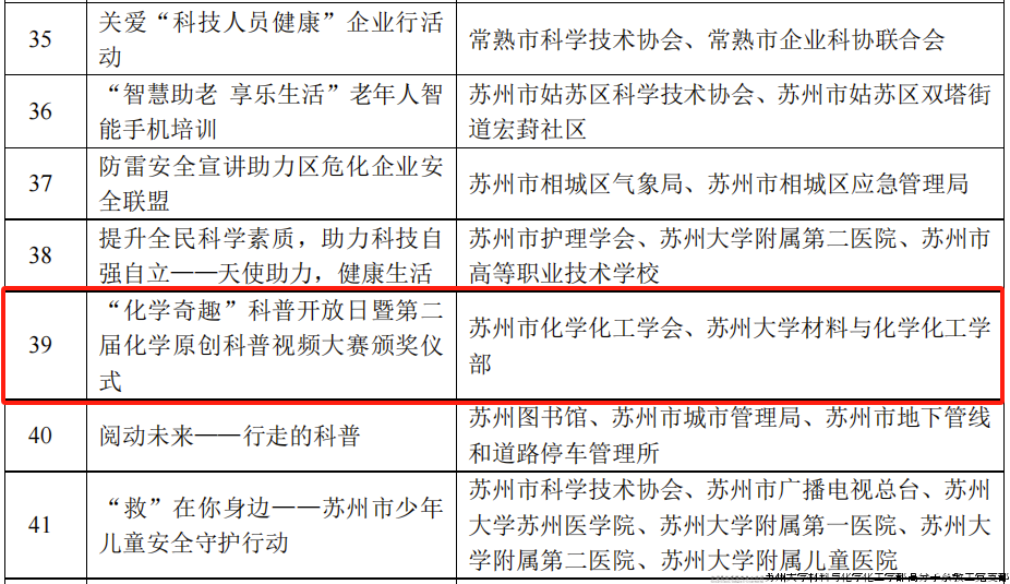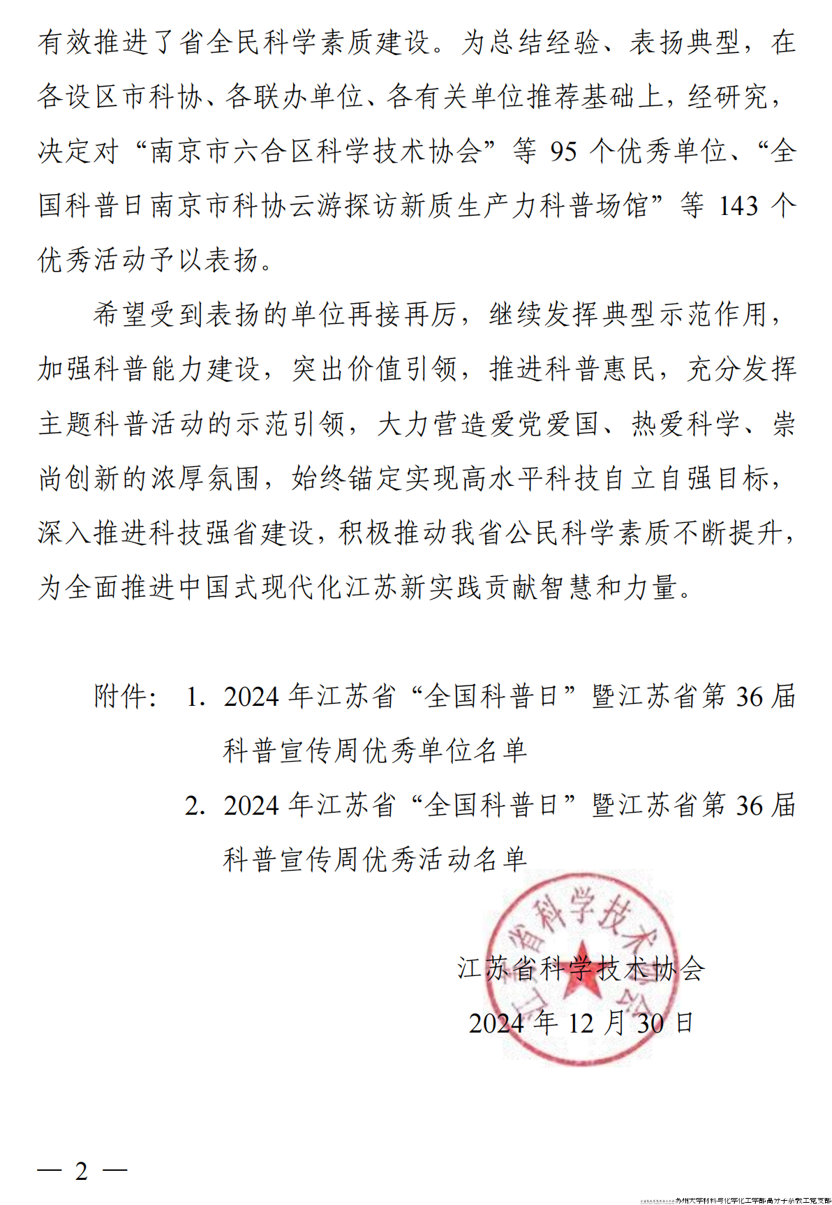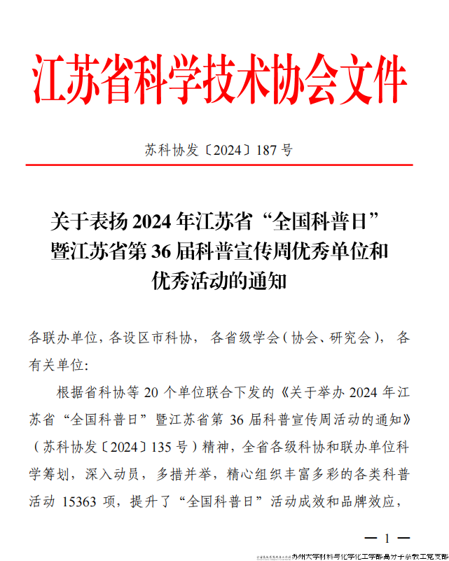 近日,江苏省科学技术协会对2024年江苏省“全国科普日”暨江苏省第36届科普宣传周活动进行表扬,支部联合主办的“化学奇趣”科普开放日暨第二届化学原创科普视频大赛颁奖仪式获评优秀活动!