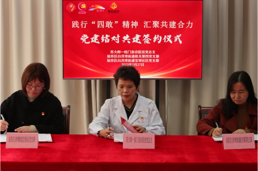 我院门急诊医技党总支和市医保局第二党支部联动共建,将“家门口”的医疗公益服务长效化机制化,并和姑苏区白洋湾街道机关第四党支部和宝邻社区党支部签订共建协议。我院门急诊医技党总支书记顾继红介绍到,未来宝邻社区“家门口”的党员公益服务将以百姓“点单”的模式,根据节气化多发疾病特征,主要针对一些社区居民的常见病、多发病、慢性病,常态化将专业的医疗服务送到社区,为百姓问诊答疑解惑。接下来,我们红细胞党群服务中心将持续走进社区开展义诊、健康科普宣传等活动,坚持党建引领,为群众办实事、办好事,找准居民所急所需,以初心践使命,为辖区居民的身心健康保驾护航。