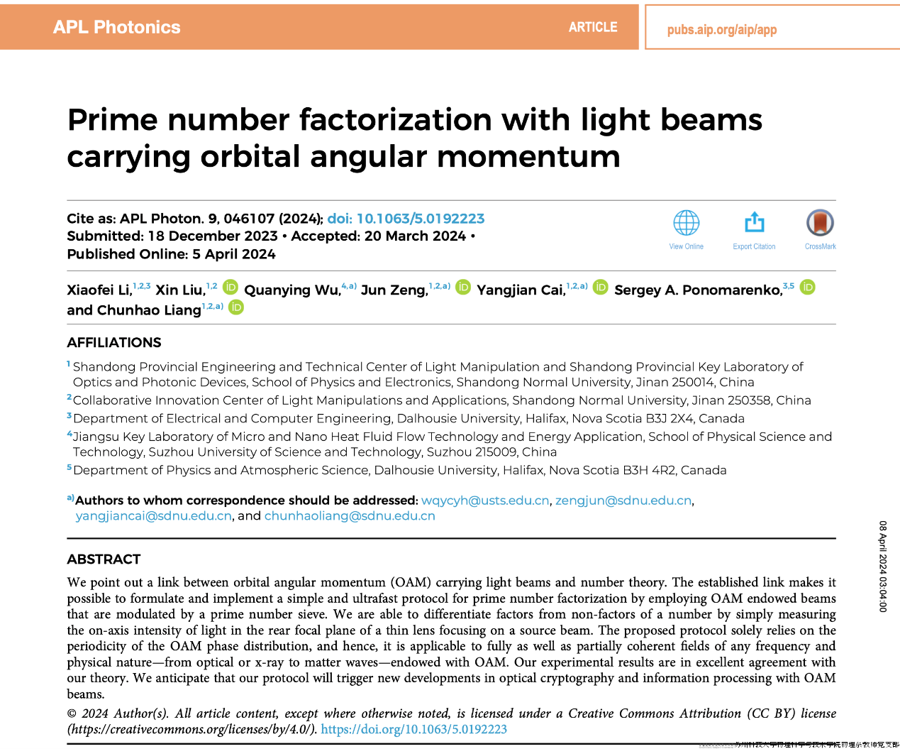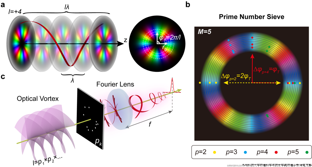 近日,支部党员吴泉英教授作为通讯作者之一,与山东师范大学物理与电子科学学院、光场调控及应用中心蔡阳健教授团队一起取得一项研究成果。该研究首次建立了轨道角动量光束与数论之间的独特联系,并利用质数筛选器调制的轨道角动量光束,成功制定并实现了一种新颖且高效的质数因子分解协议。这一开创性的成果以“Prime number factorization with light beams carrying orbital angular momentum”为题,发表在物理学一区期刊《APL Photonics》上。论文提出并实现了一种概念简单、高效的经典光学方法来进行质数分解,该方法基于携带轨道角动量的涡旋光束在自由空间中传播相位分布的固有周期性,待分解的因数对应于光束的拓扑电荷,并且所有试验因子都被封装到筛选器中,实验上利用数字微镜装置快速刷新筛选器以改变试验因子理论上可以在3.55秒内分解出高达10^6数量级的所有质数。